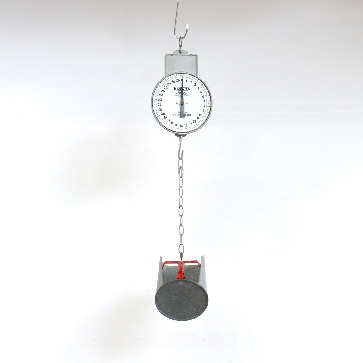 商品説明 explanation | 「HANSON」社のハンギングスケールです。(MODEL 60) バスケット(亜鉛メッキ)付きで60ポンド(85.8Kg)まではかることができます。 市場のような雰囲気づくりにいかがでしょうか。 |