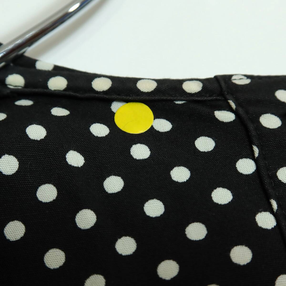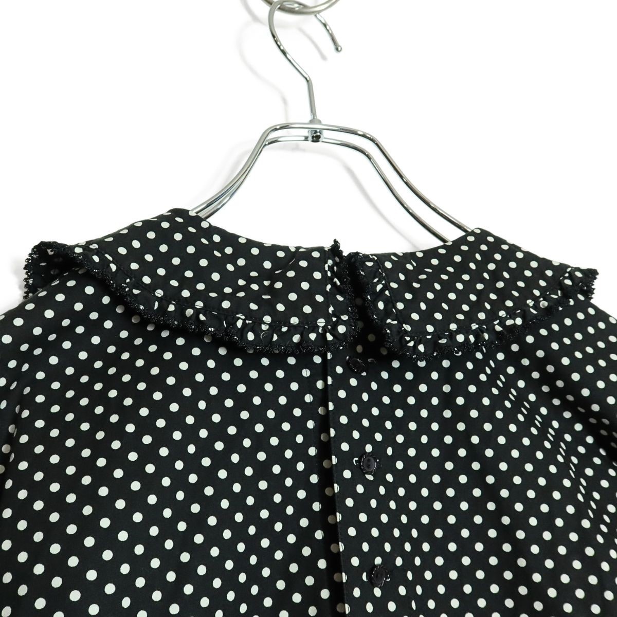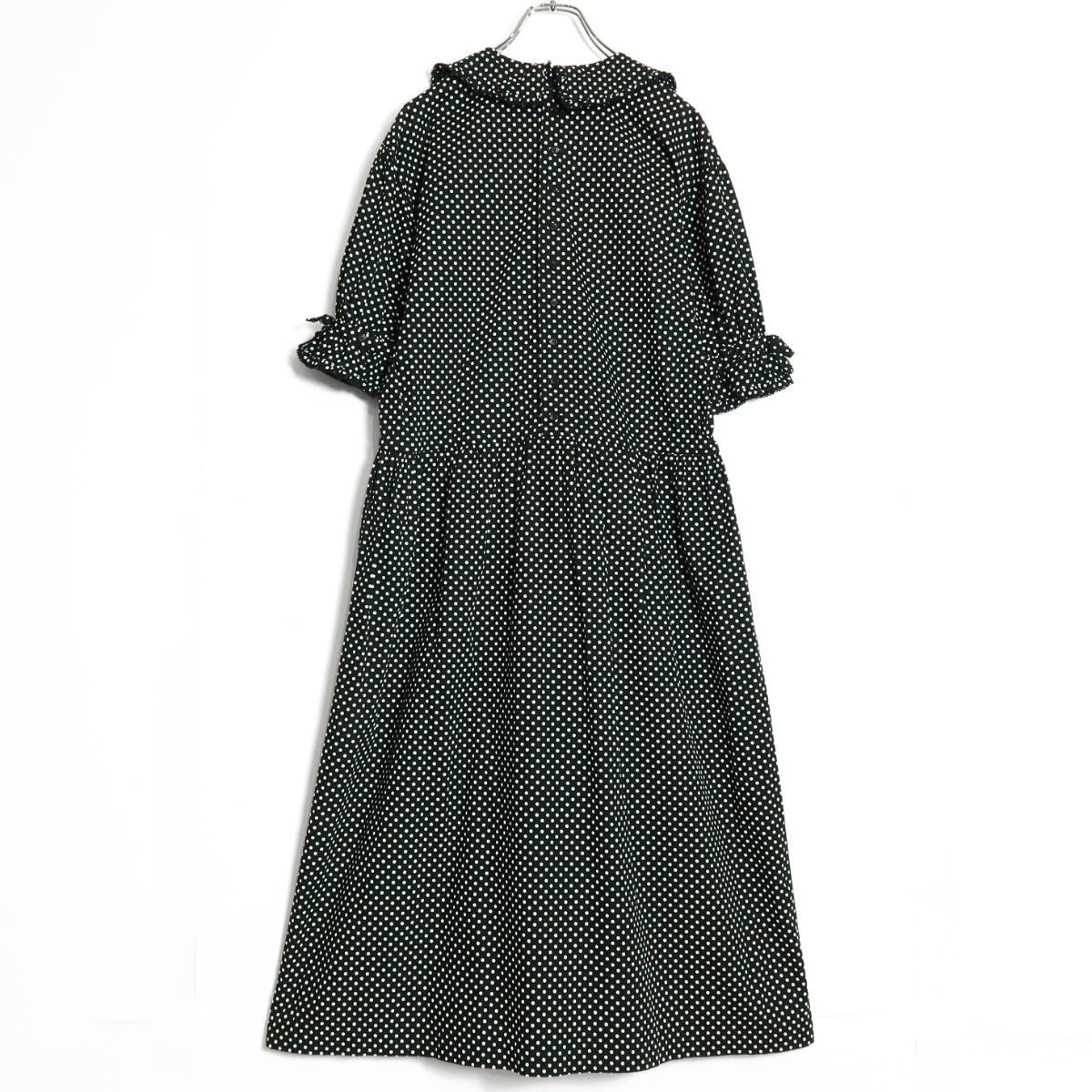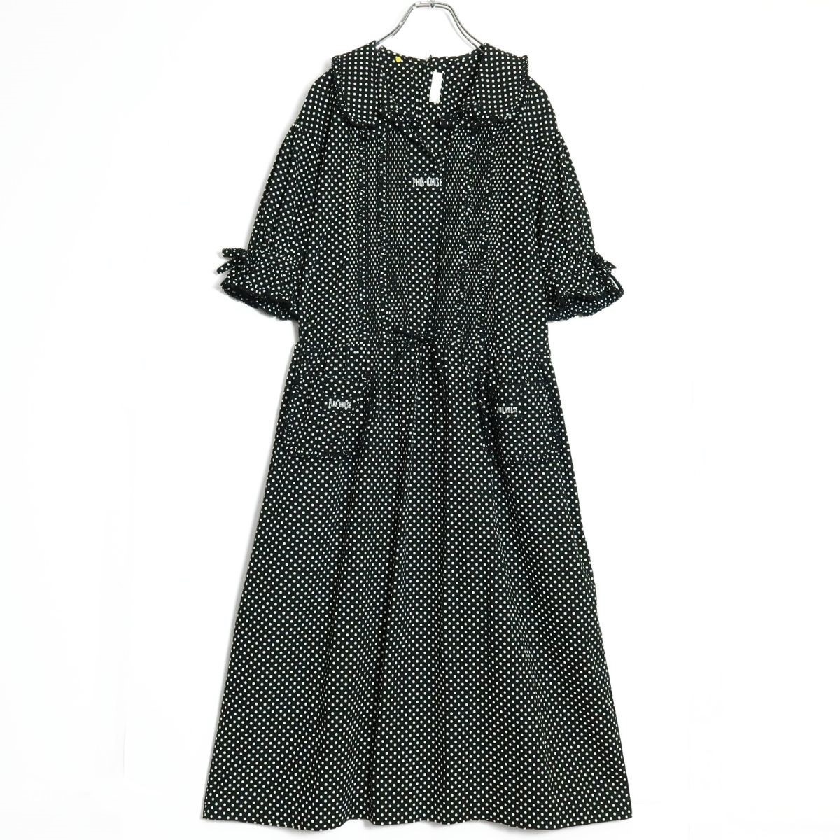 商品説明 | 【実寸約】肩幅49袖丈29バスト100ウエスト94着丈117(cm) 【サイズ表記】なし。実寸をご参照くださいませ。 【素材】 綿100% 【状態】普通の使用感のあるお品物 襟に変色感がございますそれ以外は着用感少なめのお品物です。 【デザイン】ブラック系 上品でレトロ懐かしいデザインのドット柄ワンピースです。 半袖のパフスリーブが可愛い♪ ウエストは内蔵リボンでブラウジング可能♪ バックの上半身にボタンあり 薄手/水玉・ロゴ刺しゅう/ポケットあり |