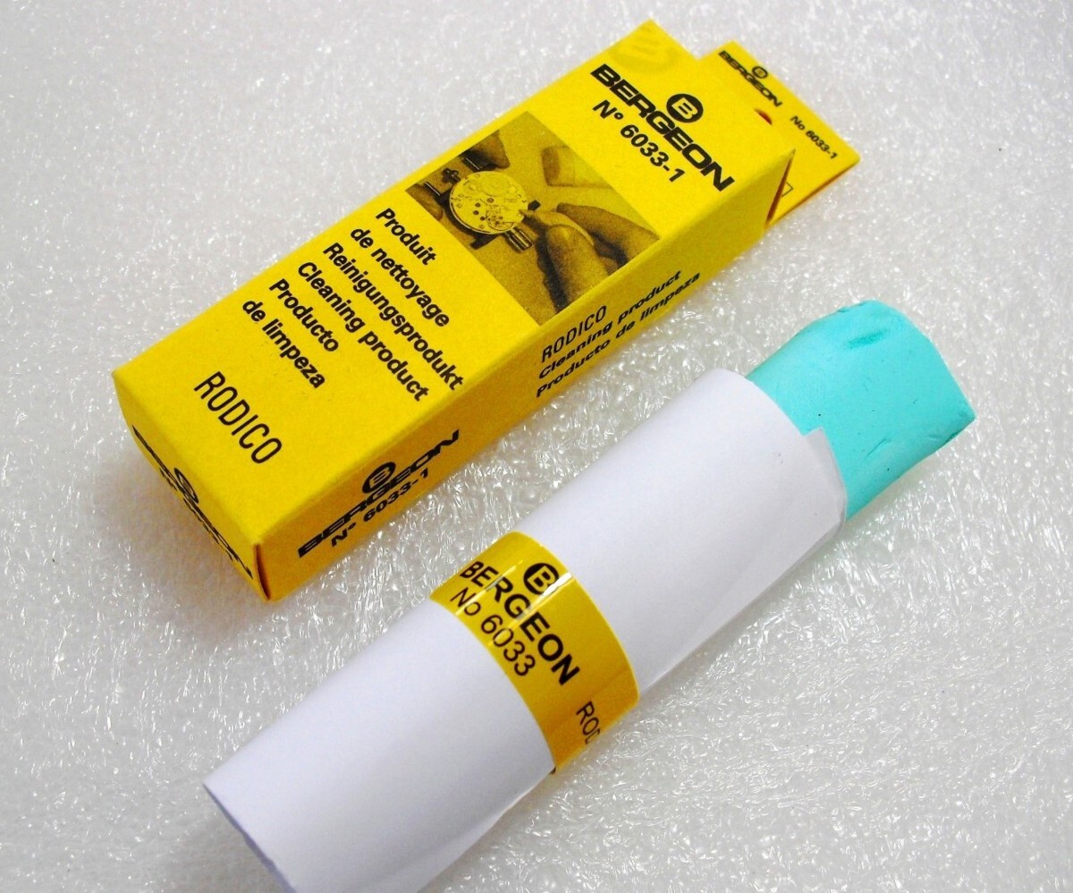 スイス時計工具メーカー老舗ベルジョン社のメンテナンス用品、 ゴミ・ほこり・ちりや油までも除去できるクリーナー。粘土のような素材で出来た商品です。 腕時計内部の 細かいゴミや汚れ取りに便利なアイテム!指紋汚れや油膜や余分な油なの除去などにも使うことが出来ます。 指などで薄く延ばしたり、細かいところはちぎったりして使用できるので、綿棒の届かない部分まで掃除ができます。