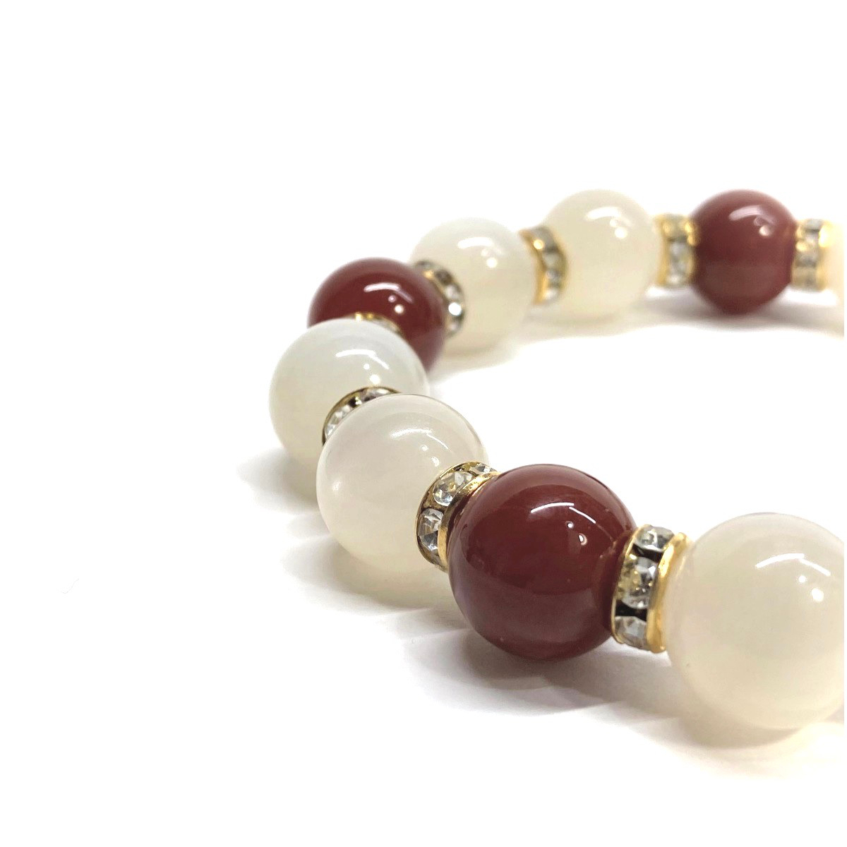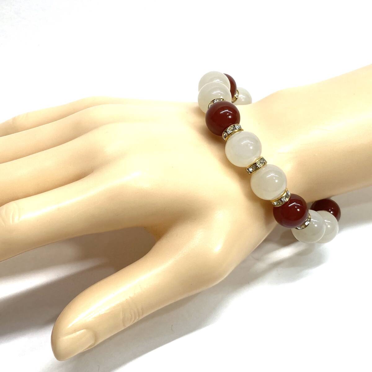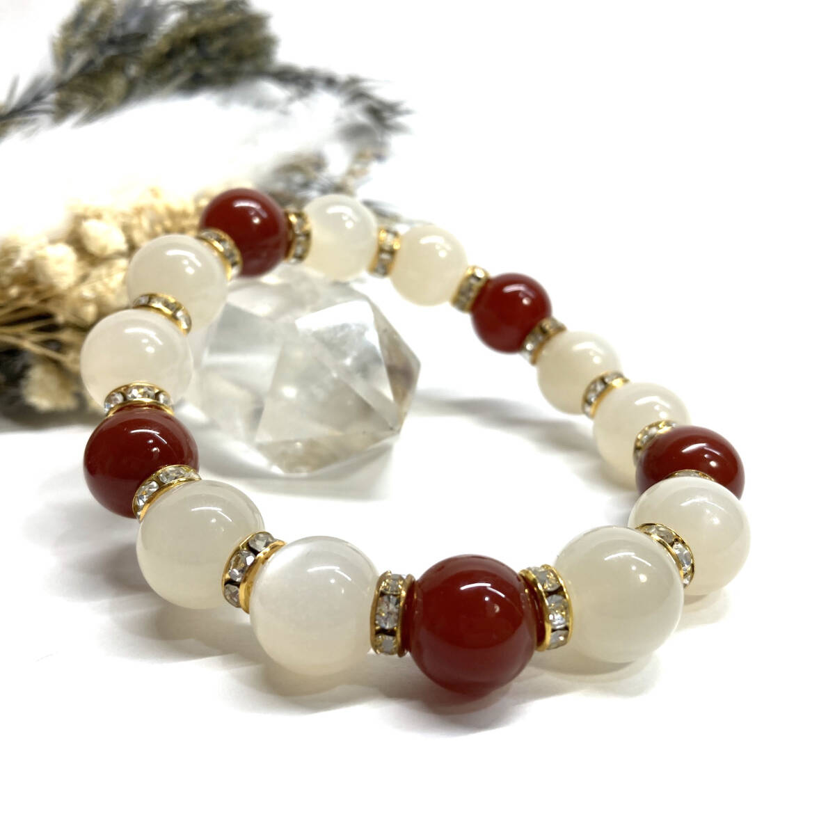 こちらは、ムーンストーンと赤瑪瑙を組み合わせたパワーストーンブレスレットです。間にはロンデルを挟み高級感あるデザインに仕上げております。程よくインパクトがある12mm玉を使用して内周約18cmです。(サイズ変更の場合は取引ナビにてご連絡をお願いします。) 数に限りがございますので気になる方はお早めにどうぞ。