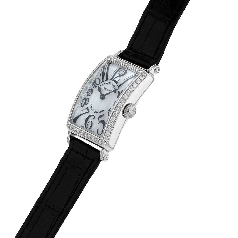 モデル情報 | フランクミュラーの豊富なコレクションの中でも、高い人気を誇るレクタンギュラーケースのロングアイランド。ダイヤル全面に広がるビザン数字やスペード型の時針など、1900年代初頭に一世を風靡したアールデコを髣髴とさせるクラシカルなデザインが特徴的です。こちらのモデルは白蝶貝のダイヤルにが光の角度によって表情を変える華やかなロングアイランドです。高級感あるフォルムでファッションアクセントからドレスアップまで美麗にきまるモデルです。 |