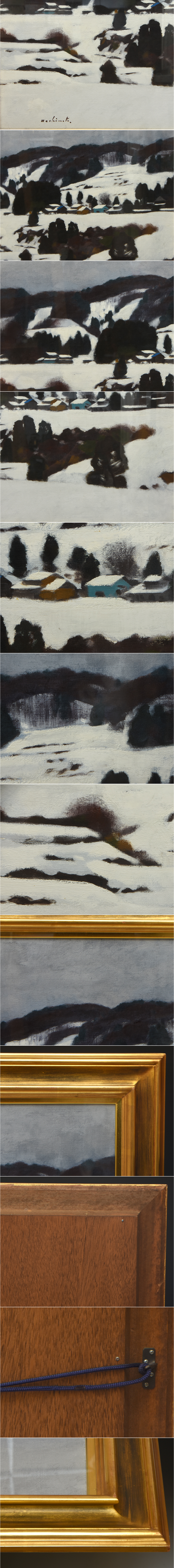【真作】 橋本博英 油絵 「越中八尾雪景」 F20号 です。 氏は明朗な色彩を用いた構成美がきわだつ風景画作品で名を馳せました。 本作も、最低限の色彩、筆触で富山の雪深い冬の情景が描かれております。 シンプルな構成ながら、微妙な色彩の変化を用い、雪の覆う山村から山々へと見事に遠近が表現されており、画家の卓越した描写力が現れています。 キャンパスに署名あり。 箱側面に泰明画廊シールあり。 目立った黄変、絵の具の剥落などなくコンディションは概ね良好です。 額は縁にややスレ、細かなあたりなど経年感が見られる部分もありますが、大きなダメージなくコンディションは良好です。(カバーにガラス板使用) 箱はやや経年感が見られます。 ※予めご了承の上ご入札お待ちしております。 ※撮影の際に生じた写り込みなどがございます。 ご理解の程よろしくお願い致します。 |
