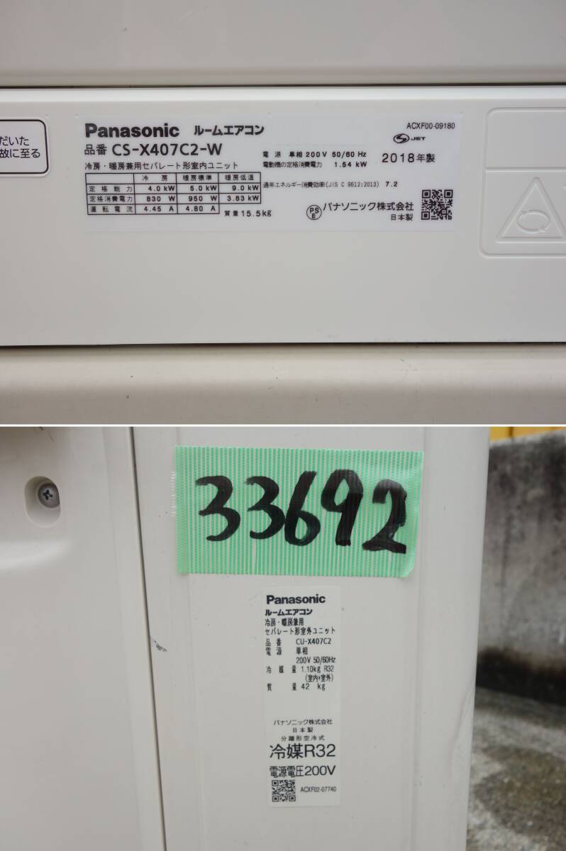 【中古】M▽パナソニック ルームエアコン 2018年 4.0kw ~16畳 単相200v Eolia エオリア エコナビ搭載 自動掃除 CS-X407C2 (33692)