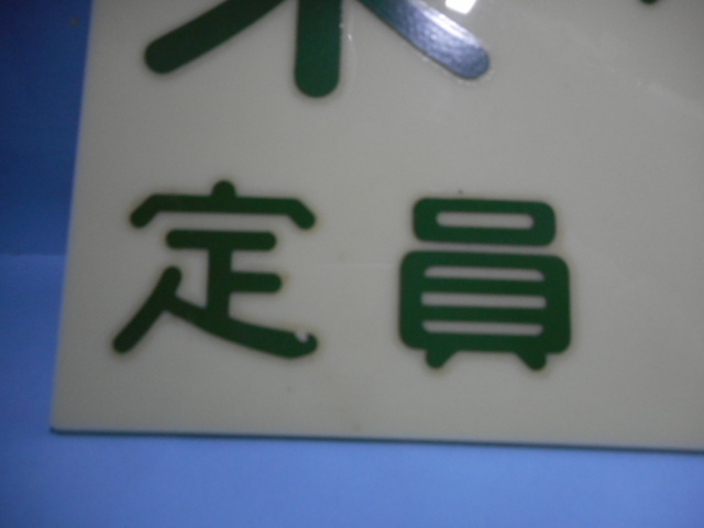 幅20センチ、縦15センチです。プラスチック製です。写真では板は白く写っていますが、経年の為プラスチック板が少し黄色っぽい感じになっています。定員の文字の定の部分に2ミリくらいの文字禿があります。詳しいことは解りません。詳しい方の入札をお願いします。発送はレターパックプラスでお送りします。新規の方や評価に悪いが沢山ある方の入札を取り消すことがあります。