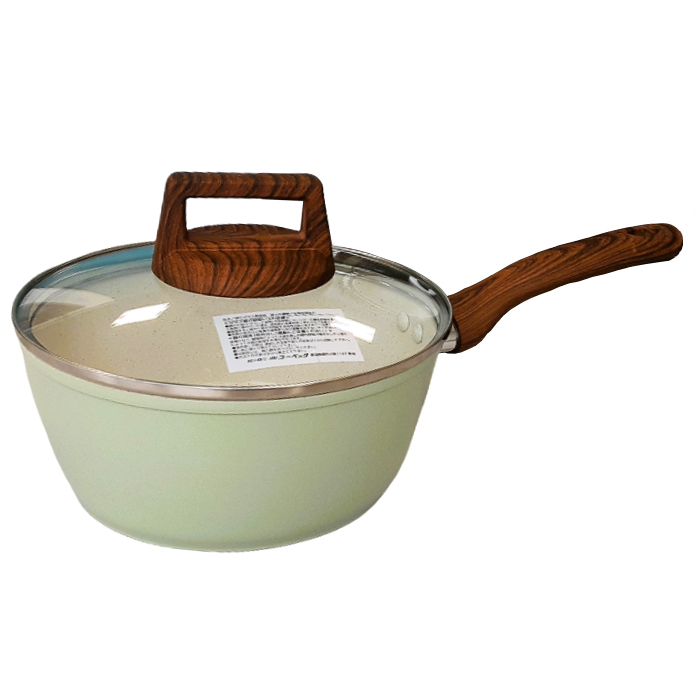 [本体]アルミ合金(コインプレス加工) [ガラス蓋]全面物理強化ガラス [底板材]ステンレス(底板厚:約2.5mm ※はり底材含む) [ハンドル・ツマミ]フェノール樹脂(木目調シリコンコーティング) [内面]3層セラミック加工(マーブル模様・アイボリー) [外面]焼付塗装(くすみグリーン) |