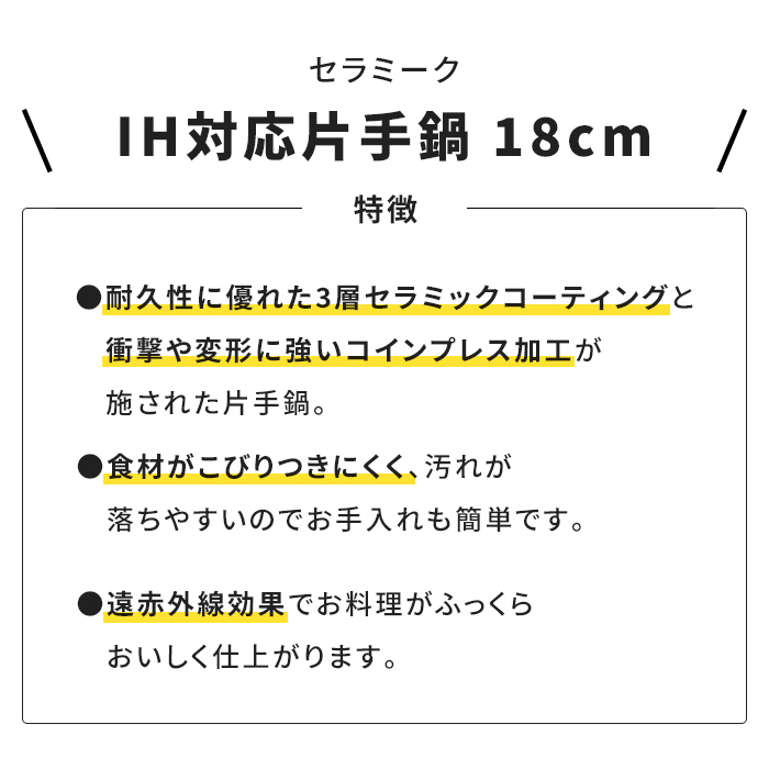 3層セラミックコーティングで耐久性抜群の片手鍋。 IHからガス火まで、すべての熱源に対応。 |