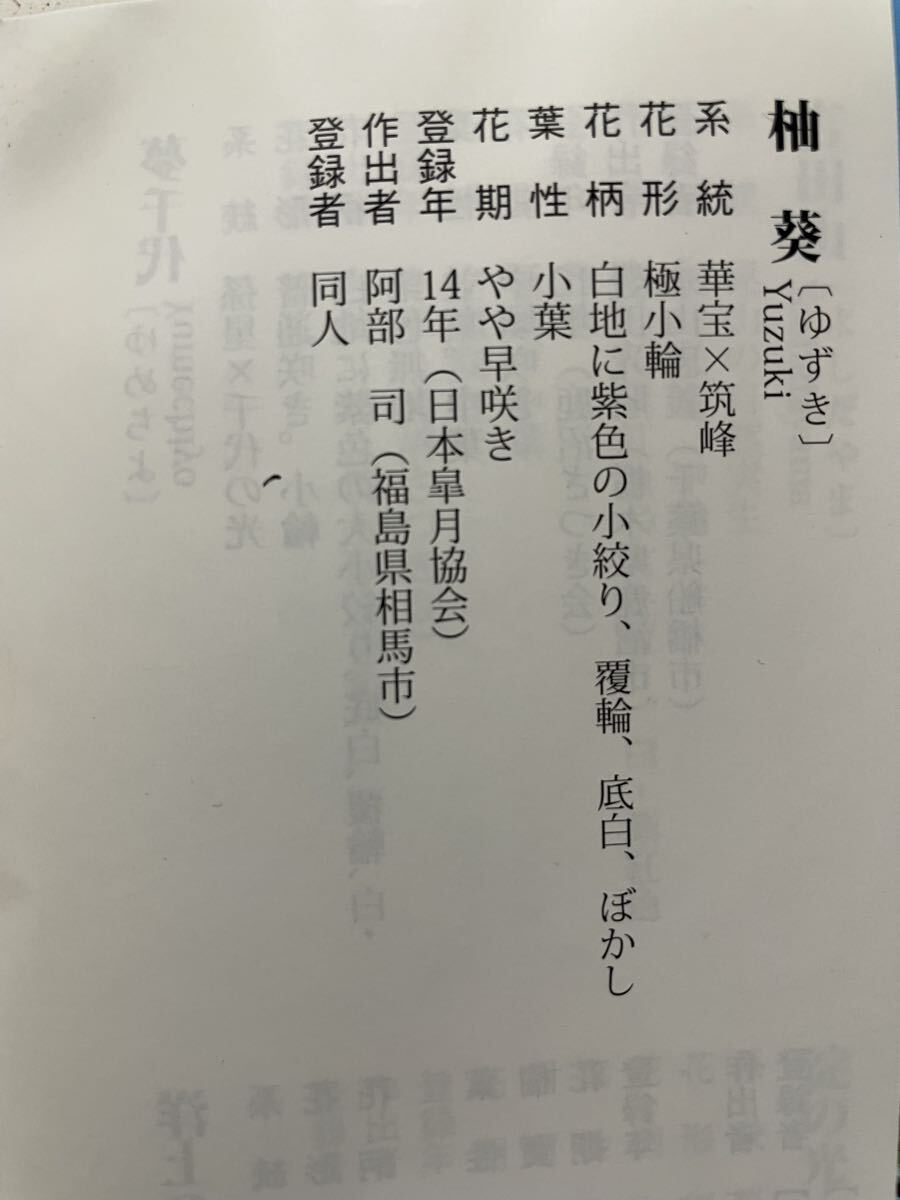 花は、白地に紫色の小絞り、覆輪、底白、ぼかし花も小さいので小品向きの品種です。