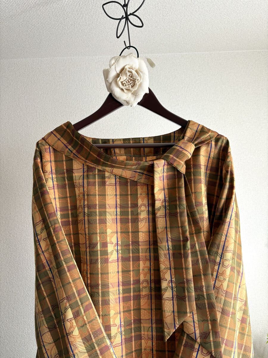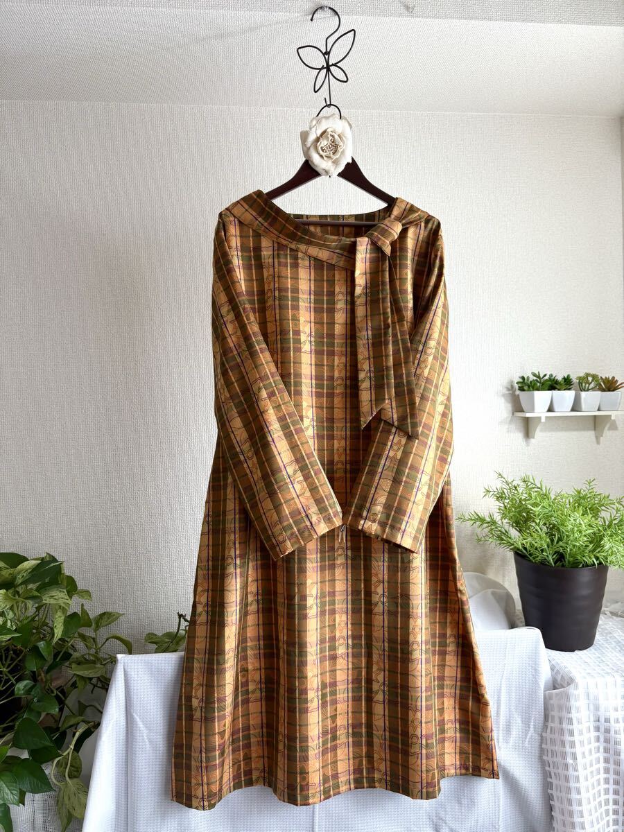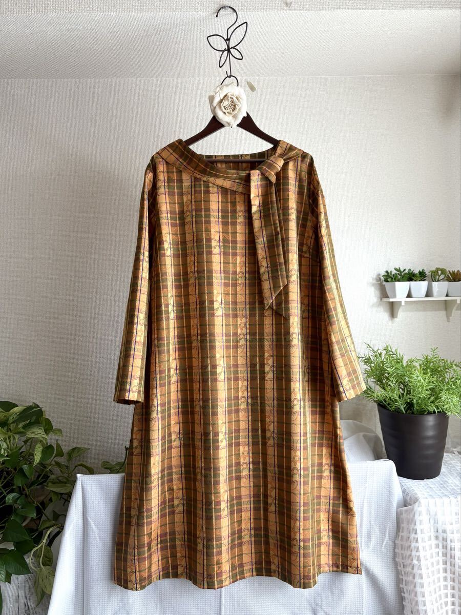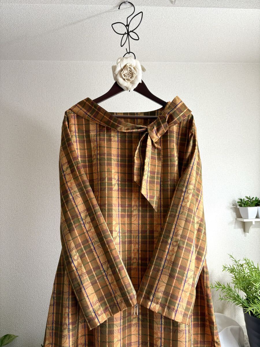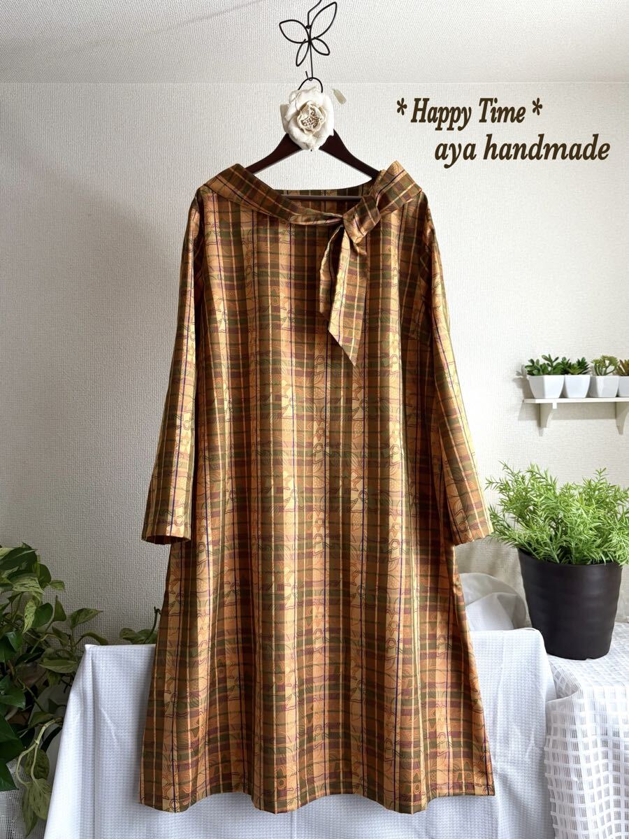 ハンドメイド* ボウタイで華やかさ 秋らしい着心地の良いゆったりワンピース 外出着OP L・LL大きいサイズ ポリエステルとシルク混 上質