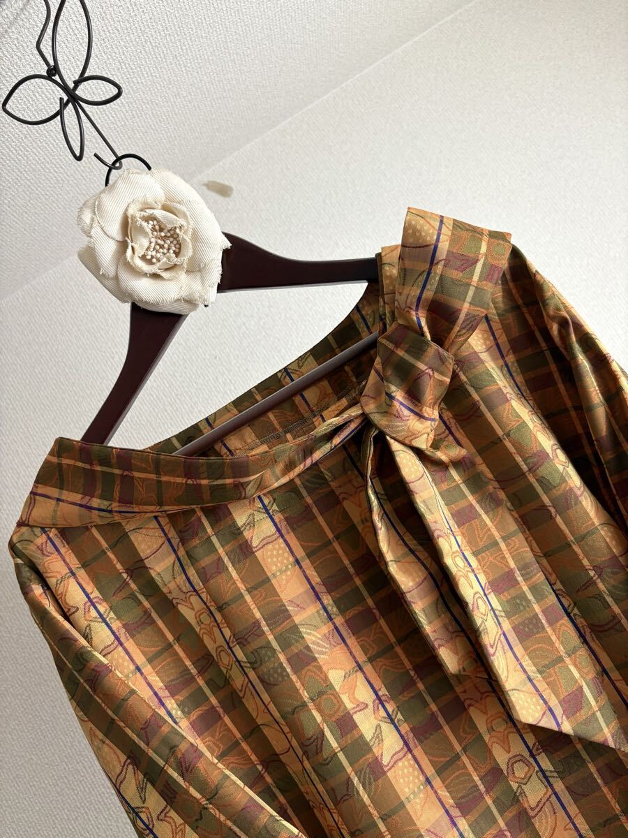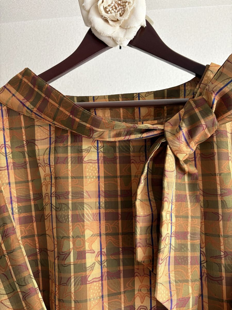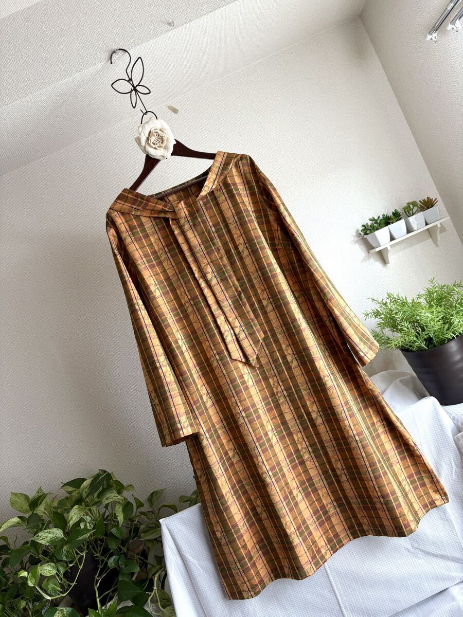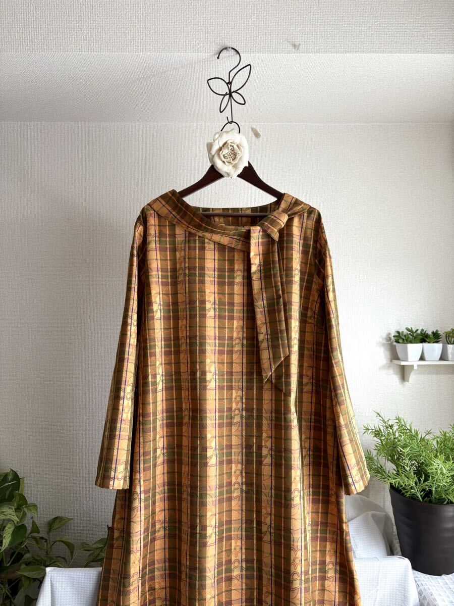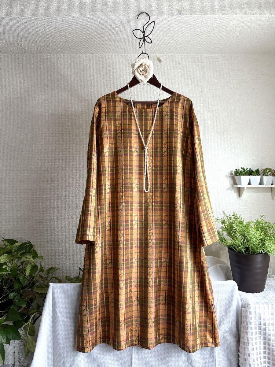 薄めの柔らかなオレンジ系とカーキ色系の格子に花模様が施された秋カラーの素敵な生地です