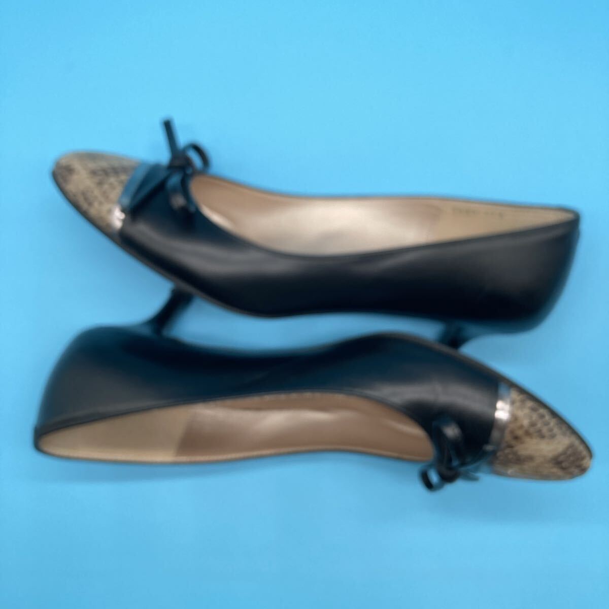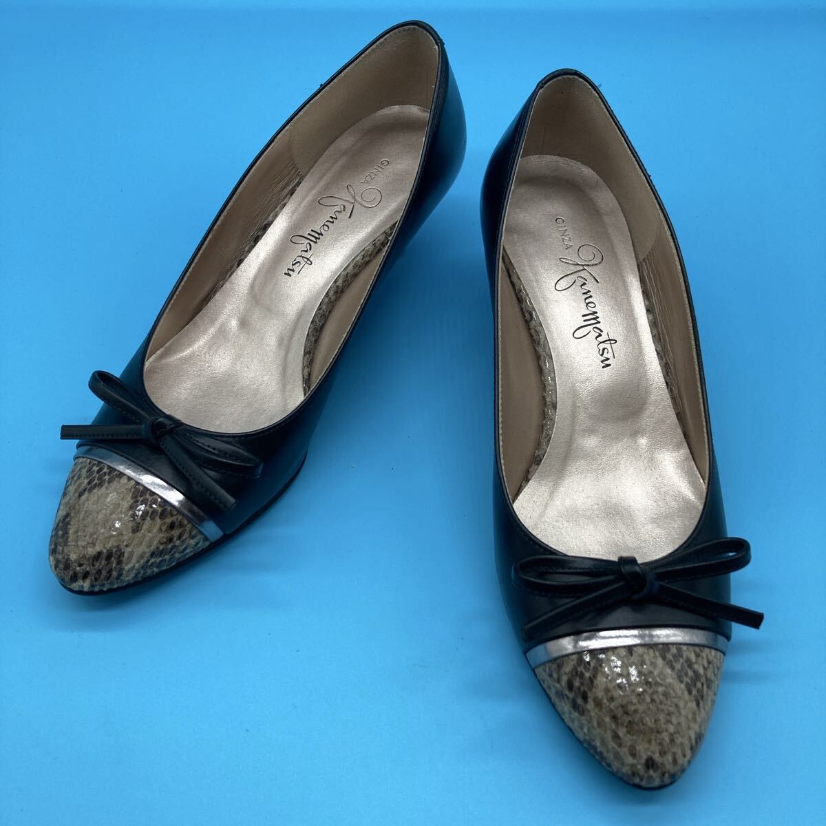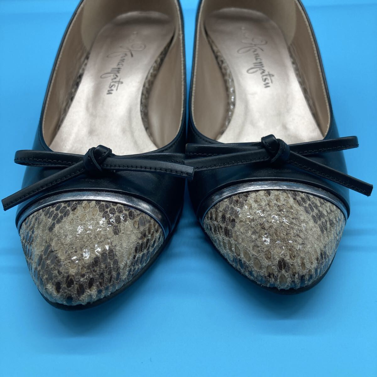 美品銀座かねまつ kanematsu パンプス レザー ヒール リボン ヘビ型押しパイソンサイズ 22.5cm 黒になります。