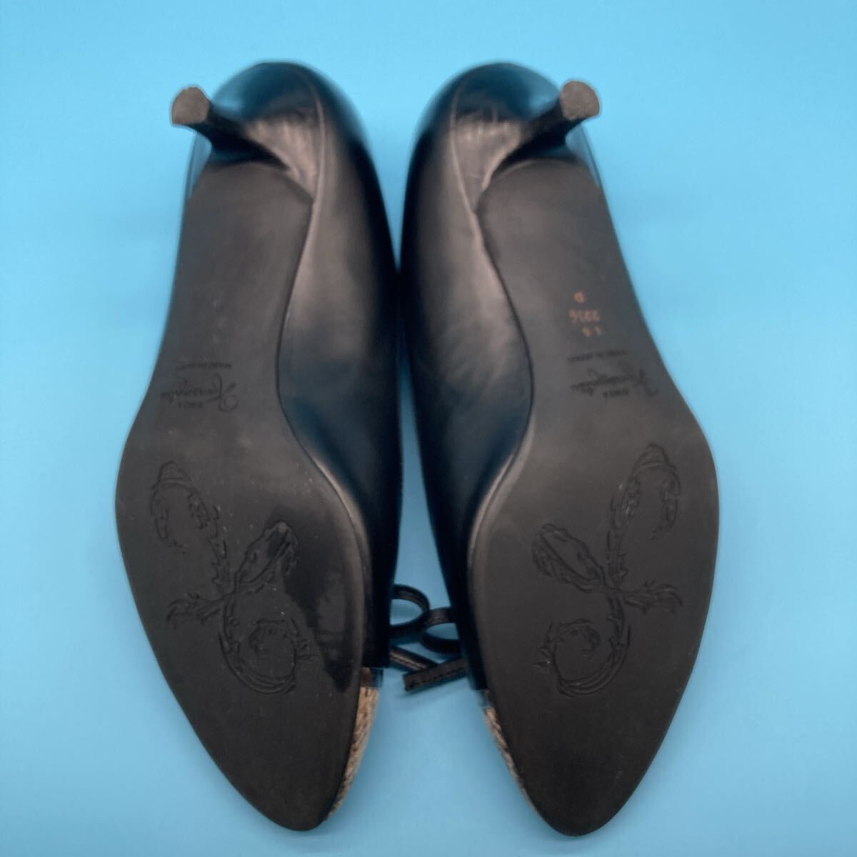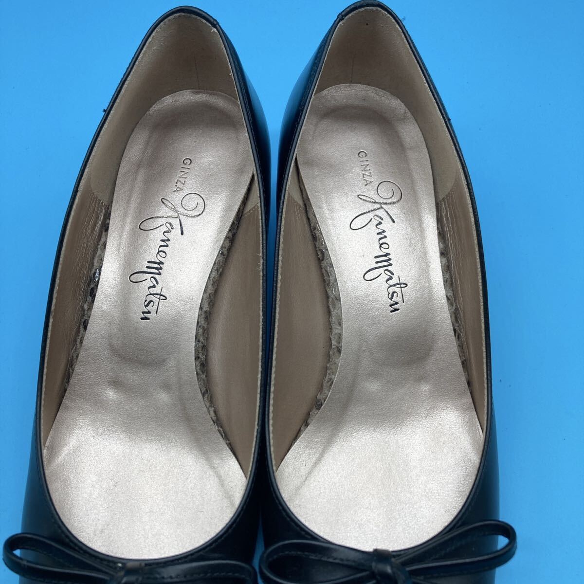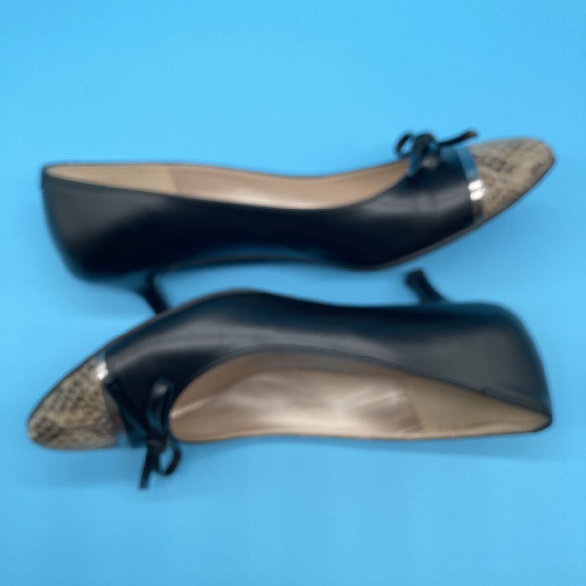 美品銀座かねまつ kanematsu パンプス レザー ヒール リボン ヘビ型押しパイソンサイズ 22.5cm 黒になります。