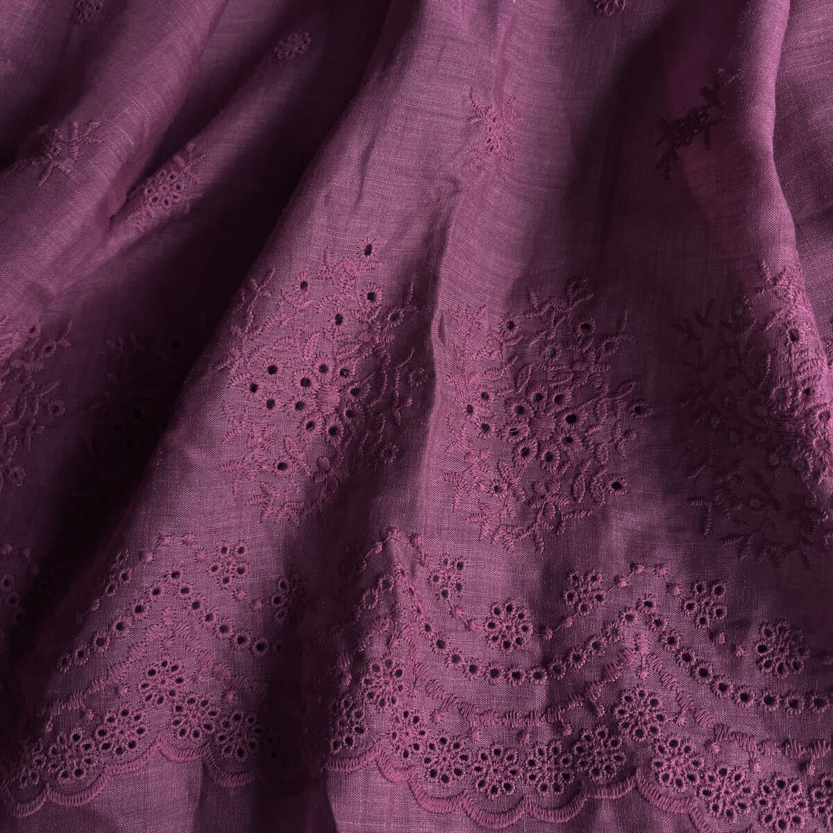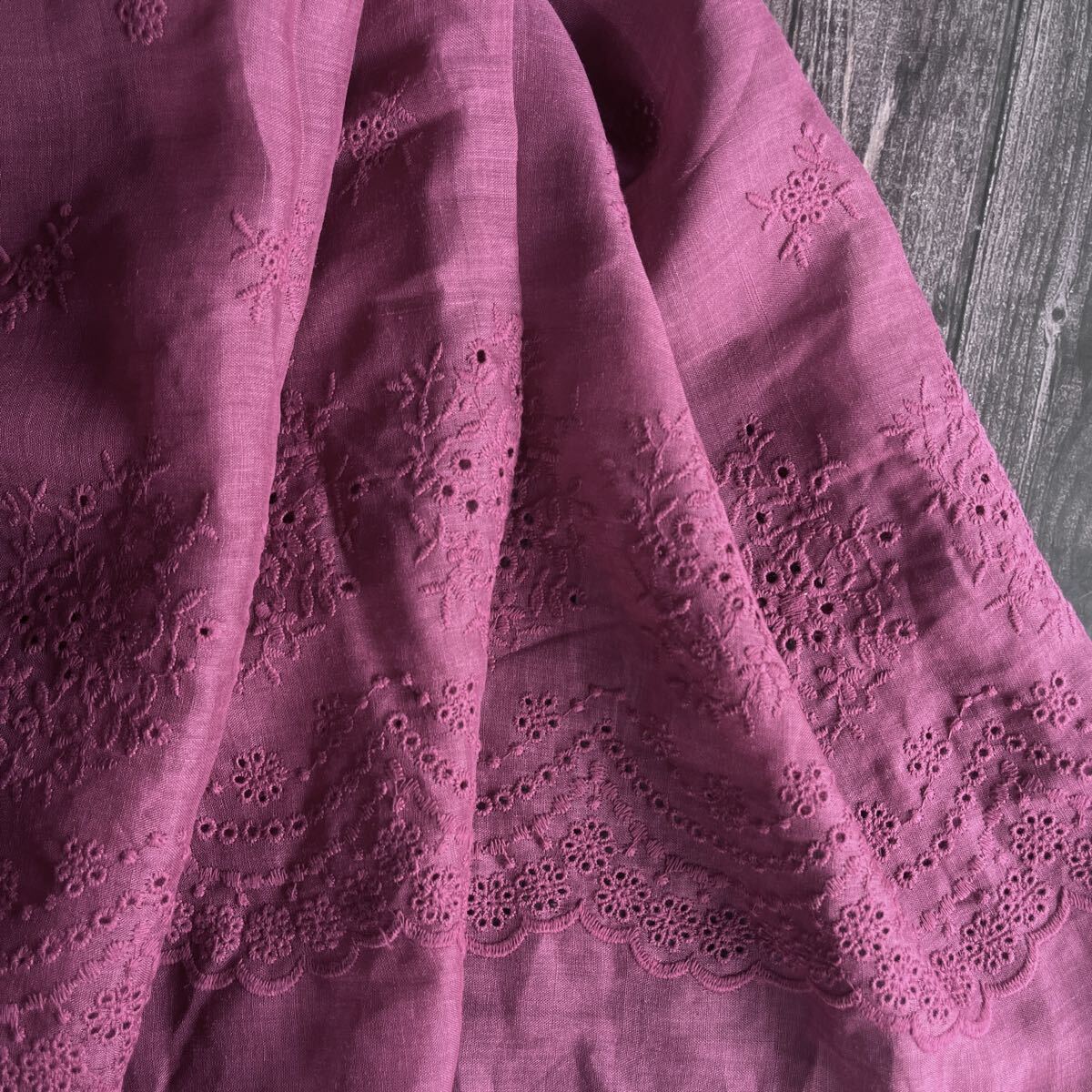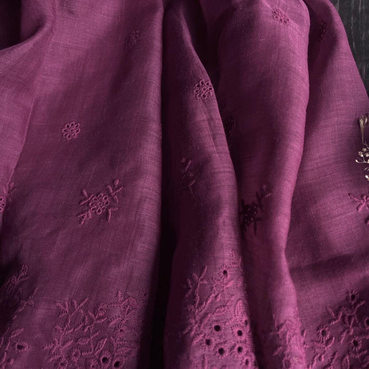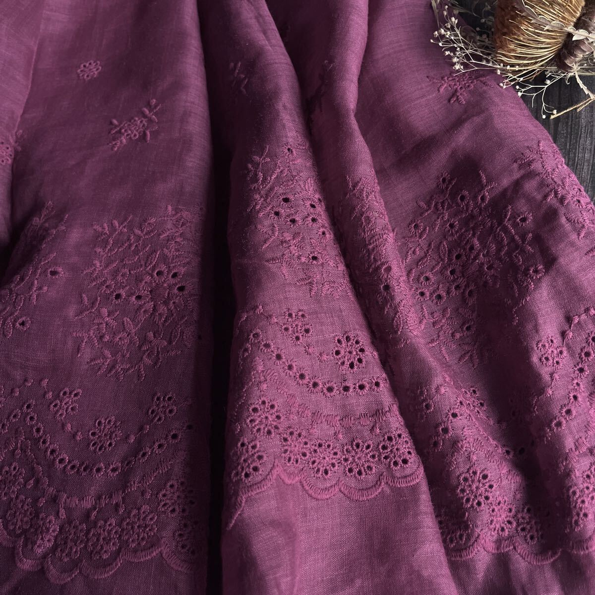 ナチュラルなラミーリネンに可憐な花柄刺繍を施した生地。落ち着いた色合いと透け感が上品で、両側スカラップの縁取りが華やかさを引き立てます。ワンピースやブラウス、ストールに最適です。