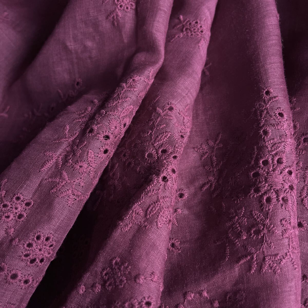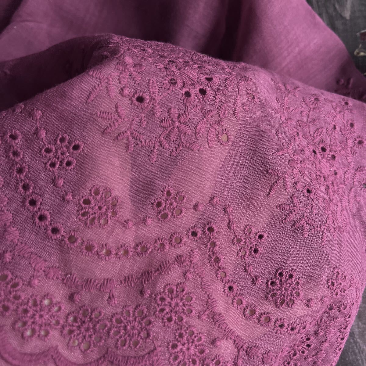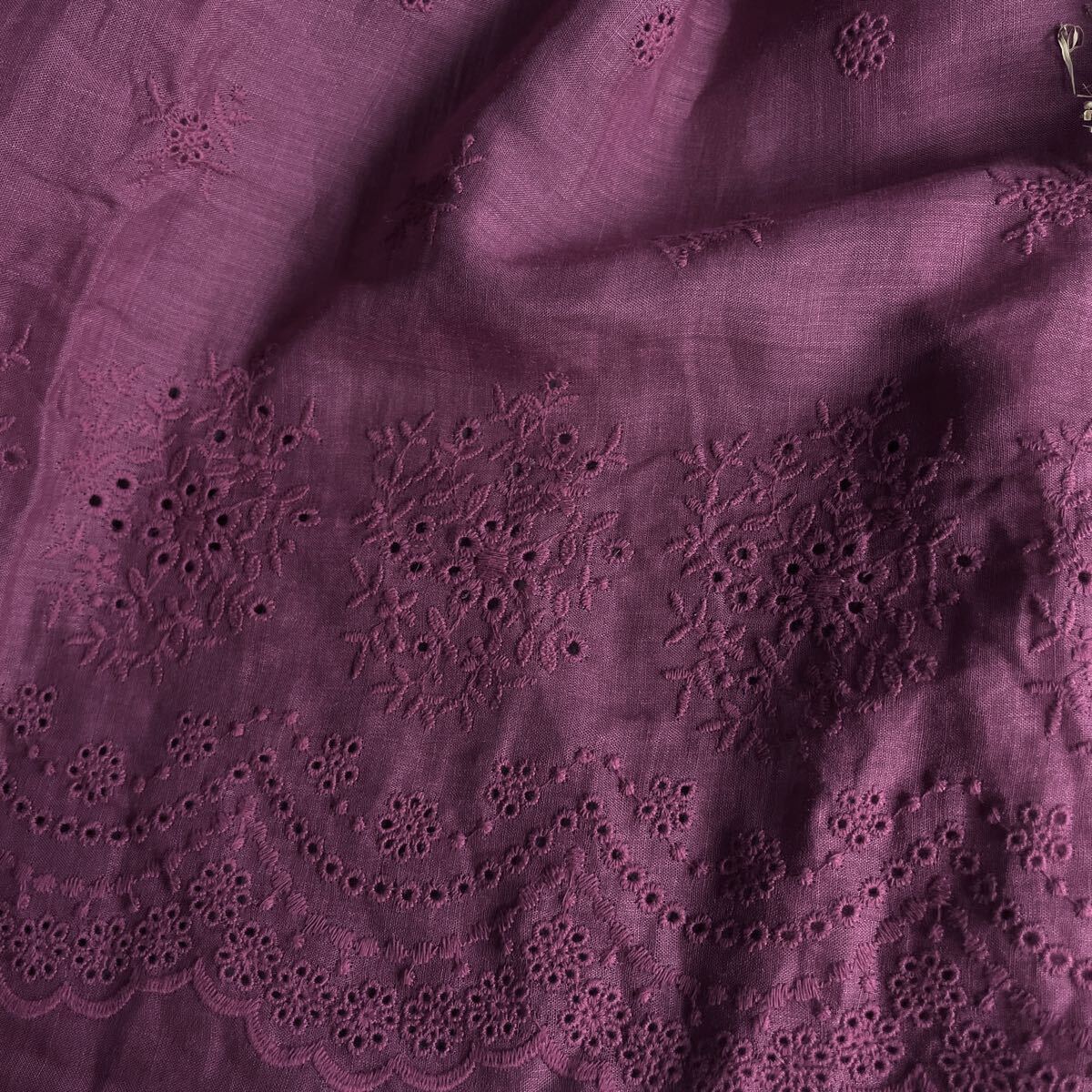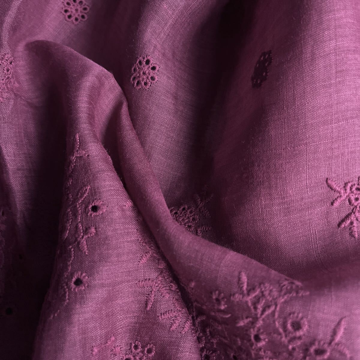 ナチュラルなラミーリネンに可憐な花柄刺繍を施した生地。落ち着いた色合いと透け感が上品で、両側スカラップの縁取りが華やかさを引き立てます。ワンピースやブラウス、ストールに最適です。