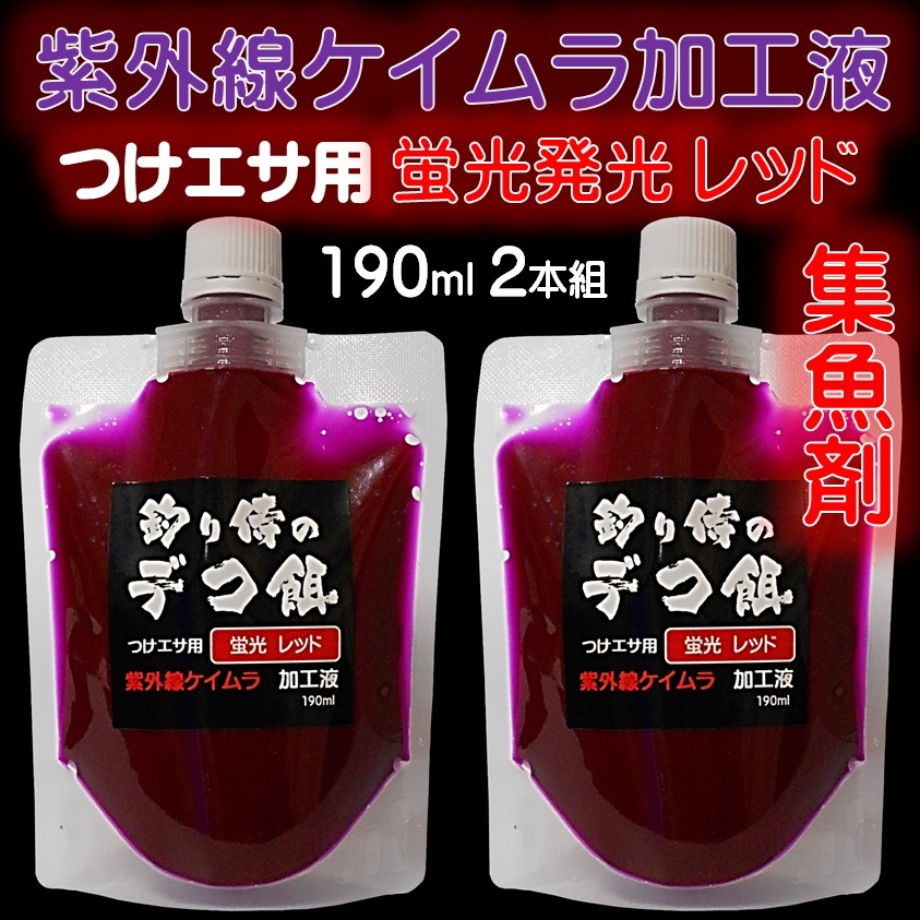 つけエサに30分漬けるだけで紫外線 ケイムラ 蛍光加工できます。 犬や猫は、人間の目に見えない紫外線の不可視光線が見えていますが、魚も同様に見えています。 ケイムラ加工液に漬けたエサは、水中で紫外線に発光して魚を誘います。 ケイムラ加工液 190mlは、コンパクトで携帯にも便利でキャップ式なので何度でもご使用になれます。 釣り侍のデコ餌シリーズは、餌釣りのつけエサをさらにデコレーションすることを目的とした集魚剤・材です。獲物(対象魚)の視覚、嗅覚、食い渋り時につけエサのみだけでなく、さらに刺激、興奮させ、針がかりしやすくすることで釣果アップを目的としています。