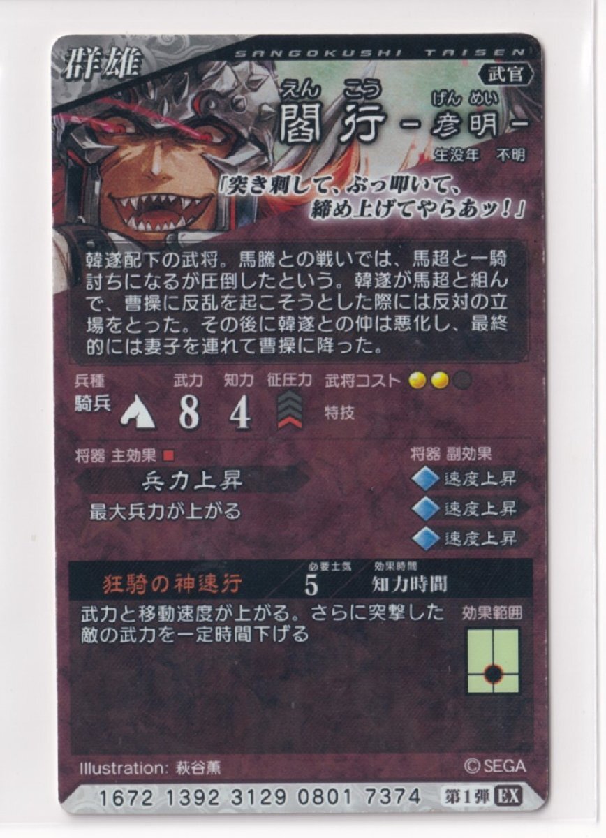 三国志大戦4 旧枠 群 1弾 R EX 閻行 狂騎の神速行 兵力上昇 コレクション用 【3子09】