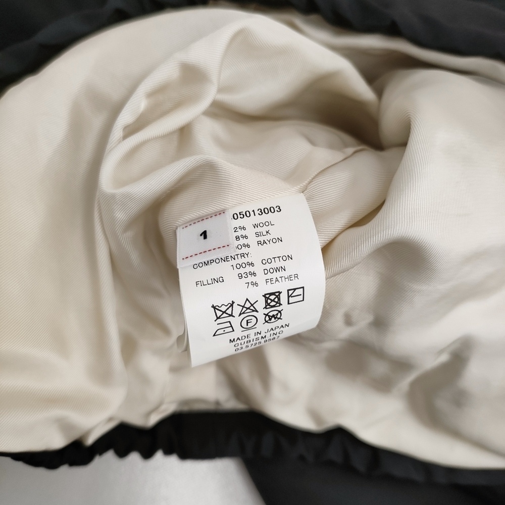 品質表示 | 表地:毛62%、絹38% 裏地:レーヨン100% 別布:綿100% 中地:ダウン93%、フェザー7% |