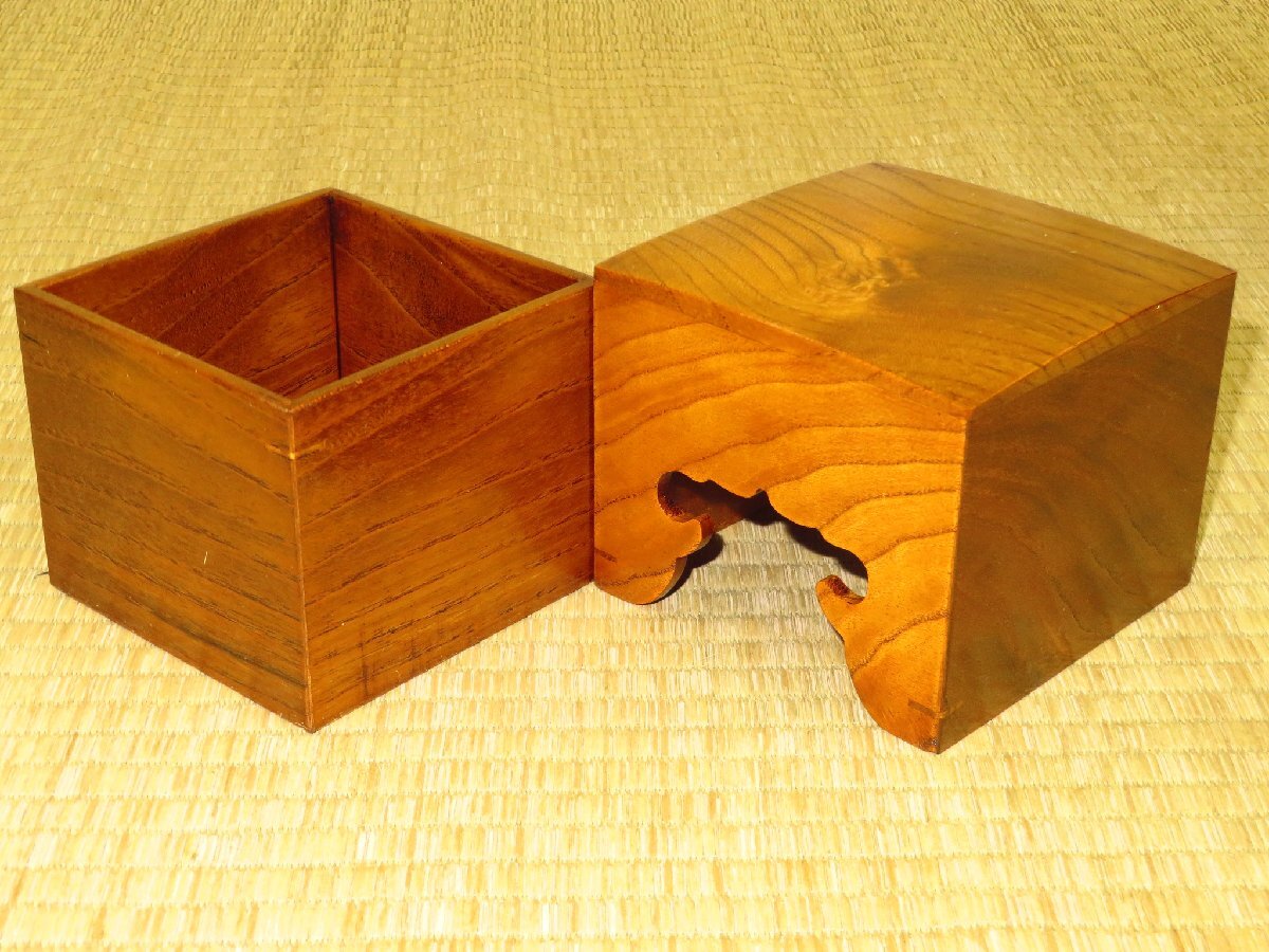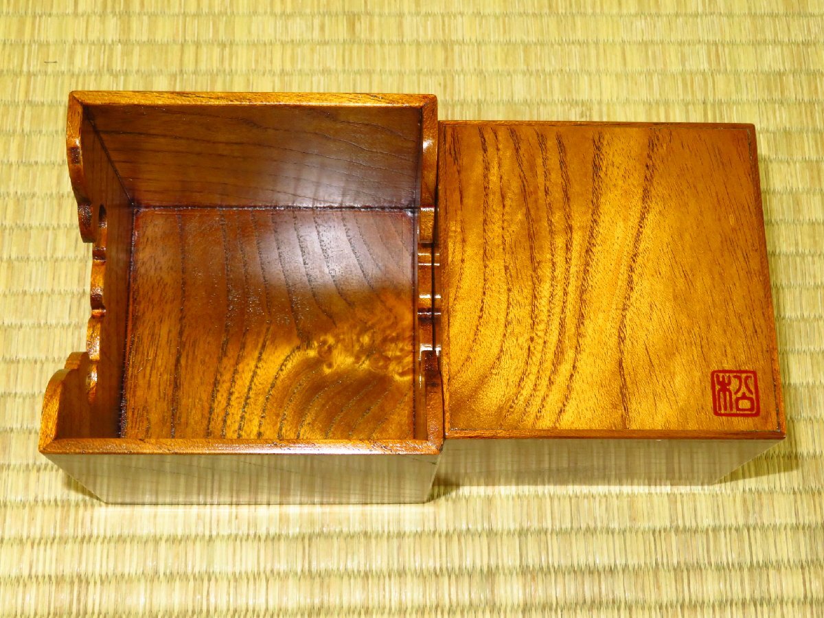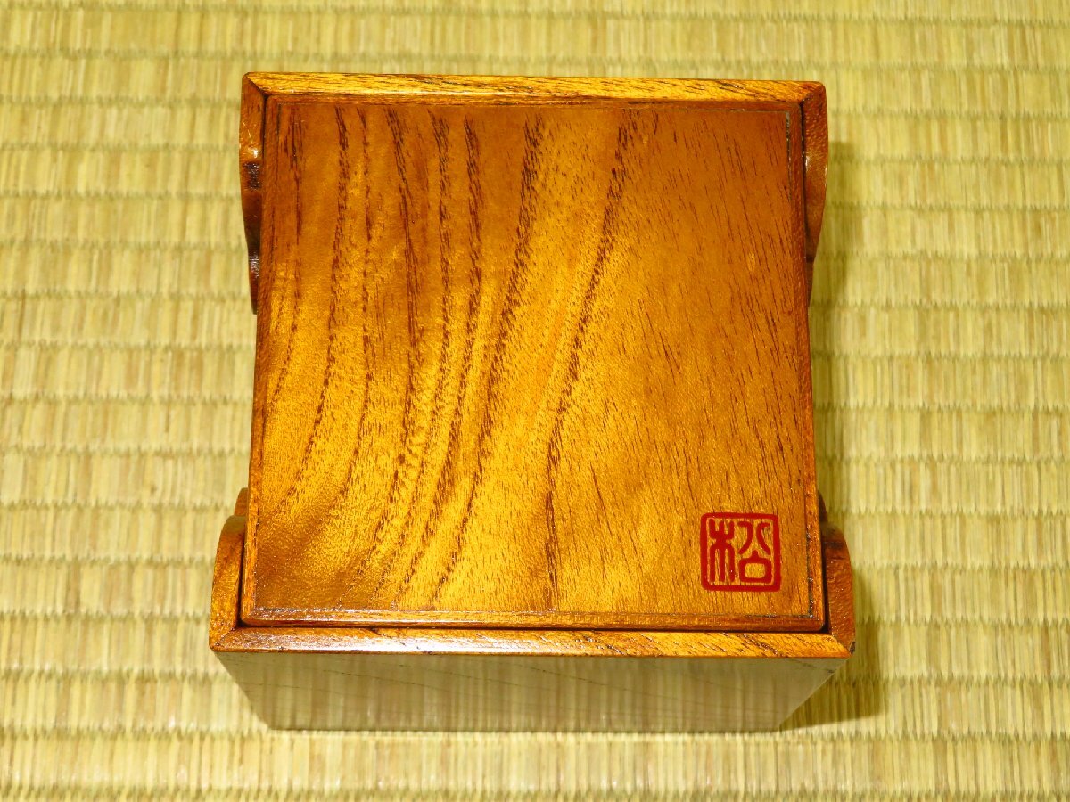 蓋の天板は(単なる接着ではなく)はめ込み式(駒箱によく有り勝ちな蓋の天面と側面の微妙なズレが生じません)、もちろん蓋の下部、内箱の上部にトメ(チギリ)が埋めてあります。