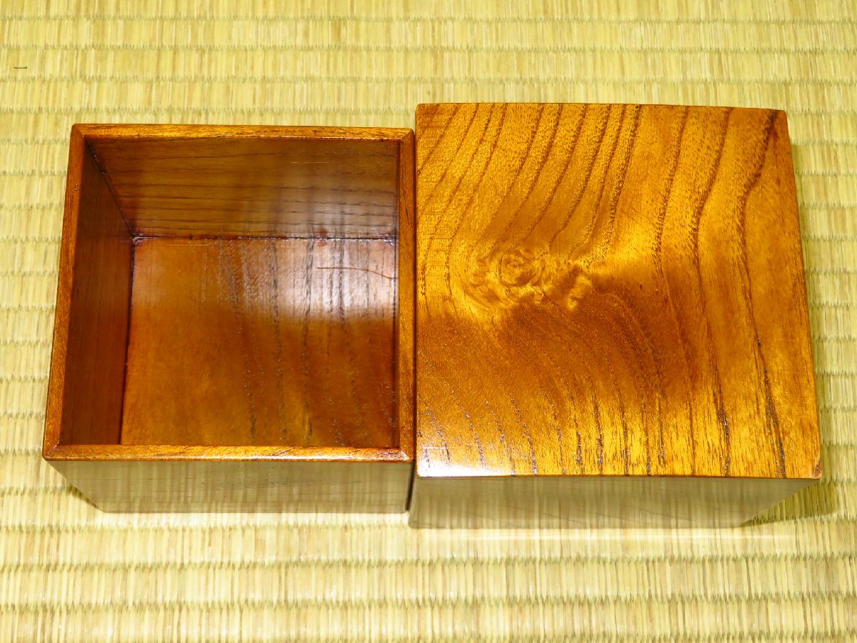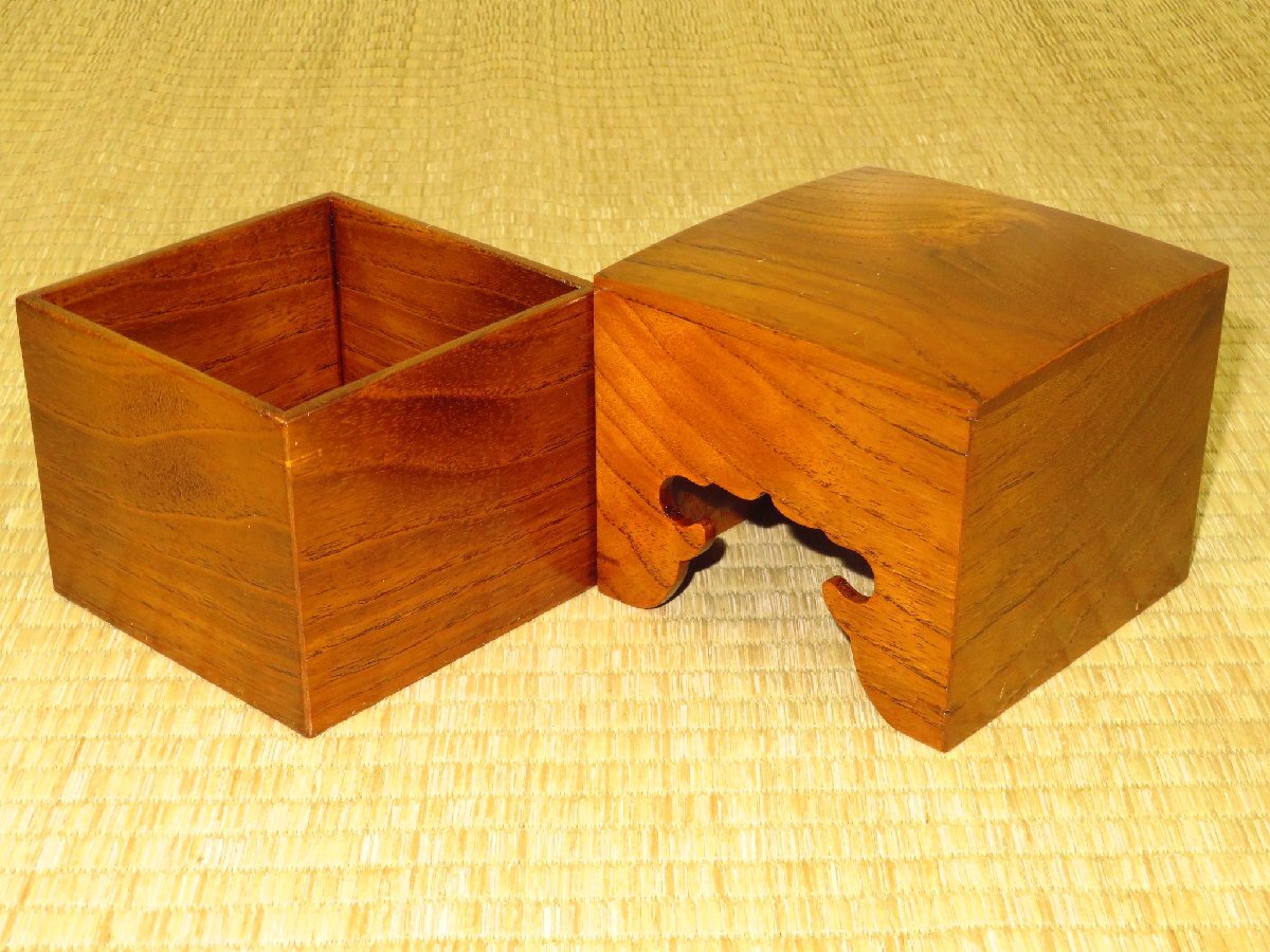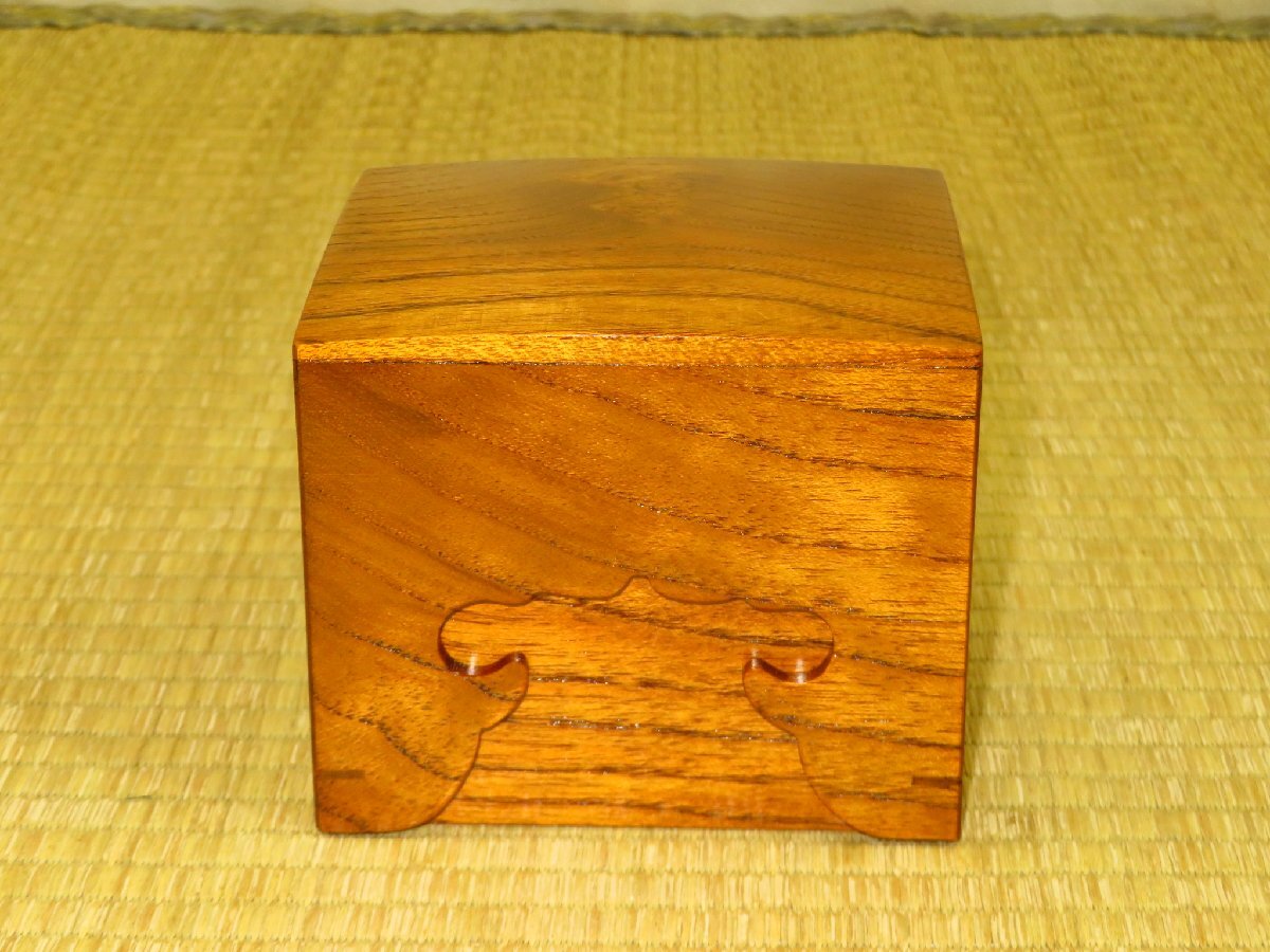 蓋の天板は(単なる接着ではなく)はめ込み式(駒箱によく有り勝ちな蓋の天面と側面の微妙なズレが生じません)、もちろん蓋の下部、内箱の上部にトメ(チギリ)が埋めてあります。