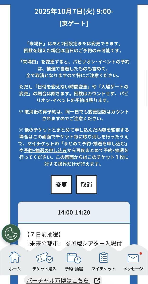 14:00〜14:20 未来の都市 参加型シアター入場付きに当選しています。