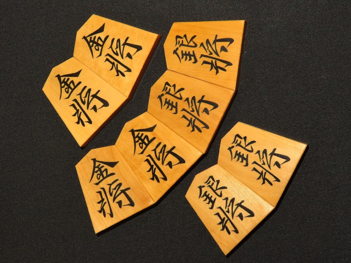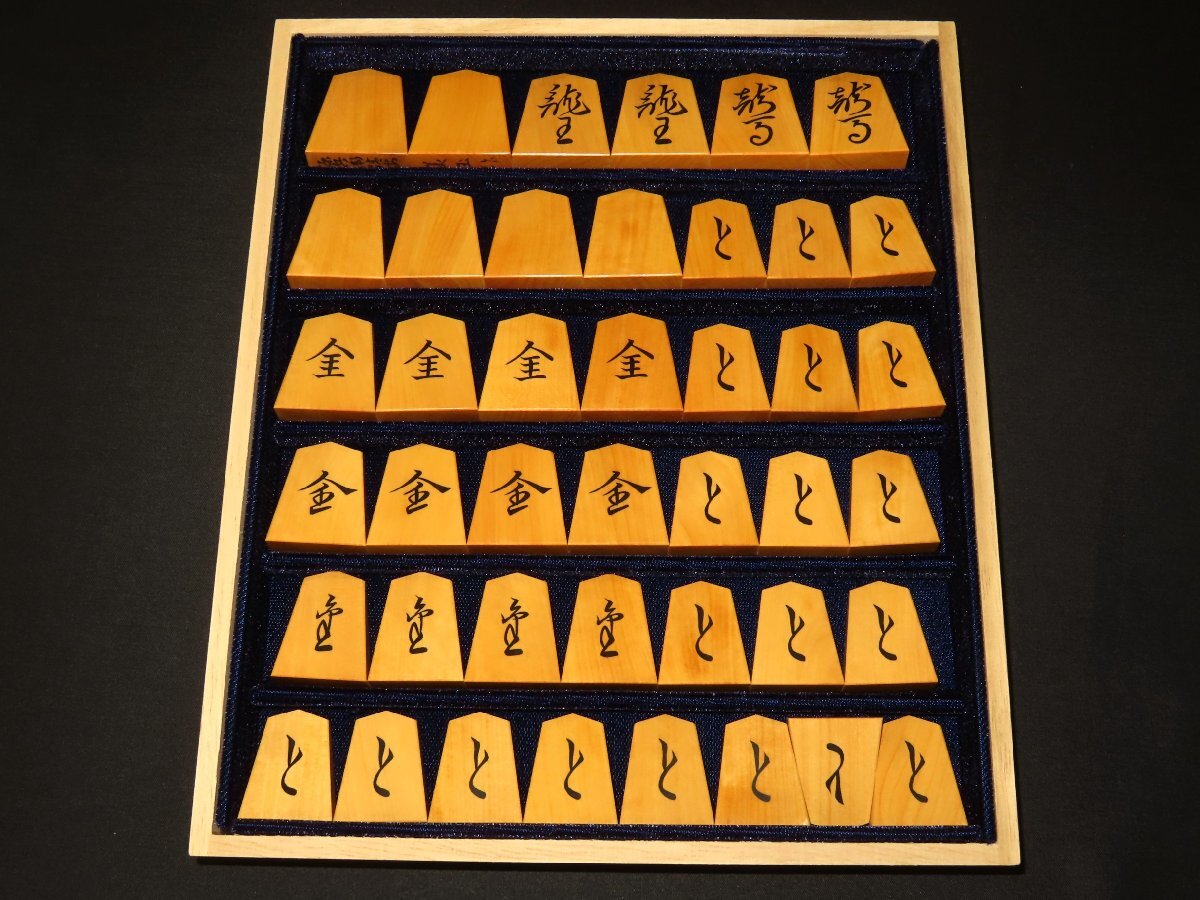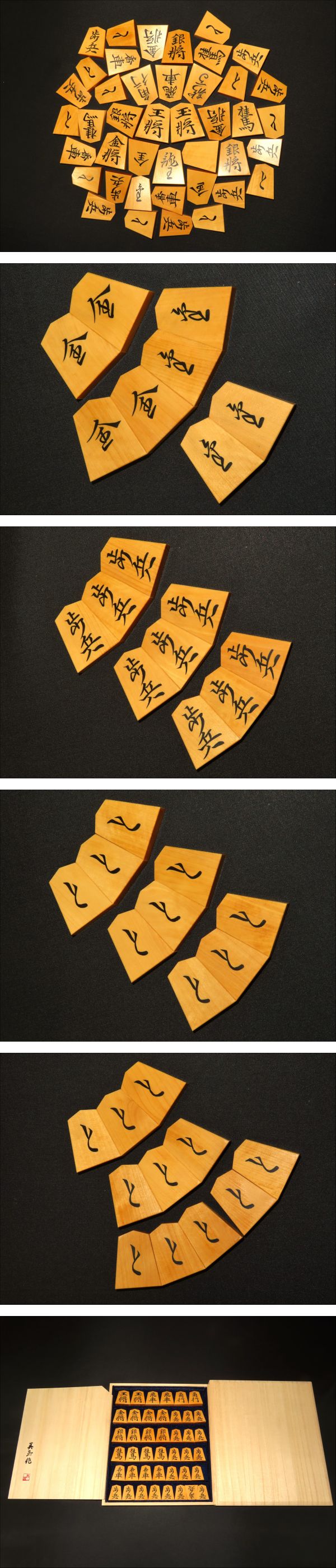 木地は御蔵島黄楊斑入柾目。ご覧の通り非常に味の良い木地です。全ての駒の表裏をUPしてございます。是非ご覧下さい。