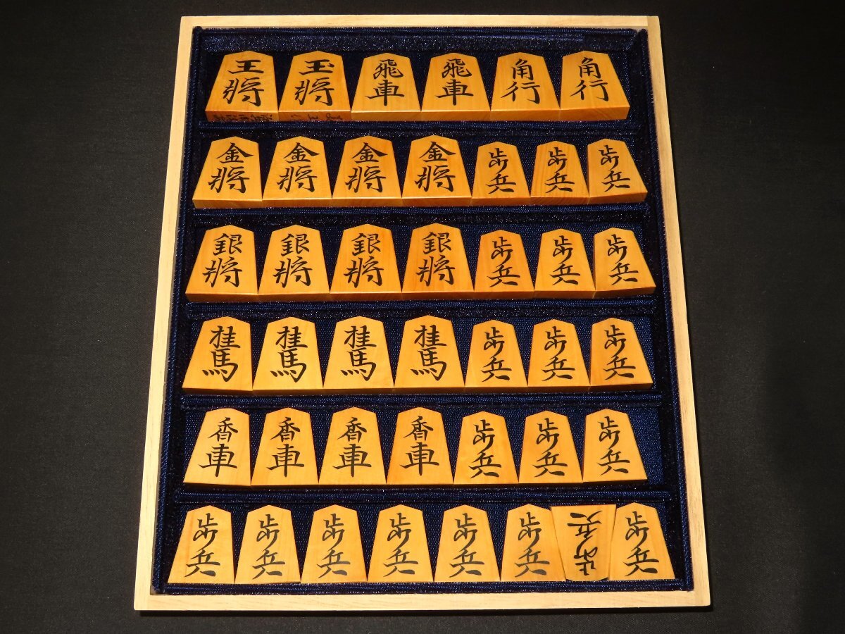 ▲美玉作源兵衛清安島黄楊斑入柾目彫埋将棋駒▲新品/桐製平箱付