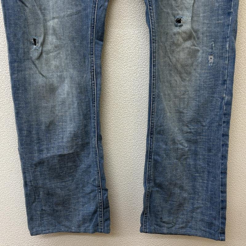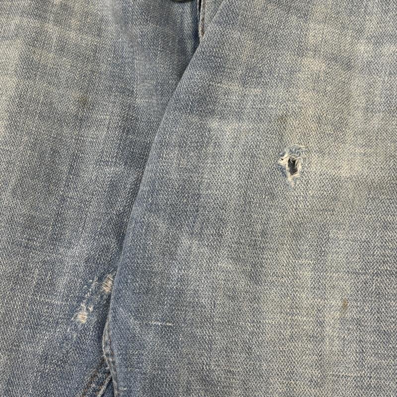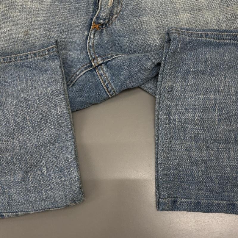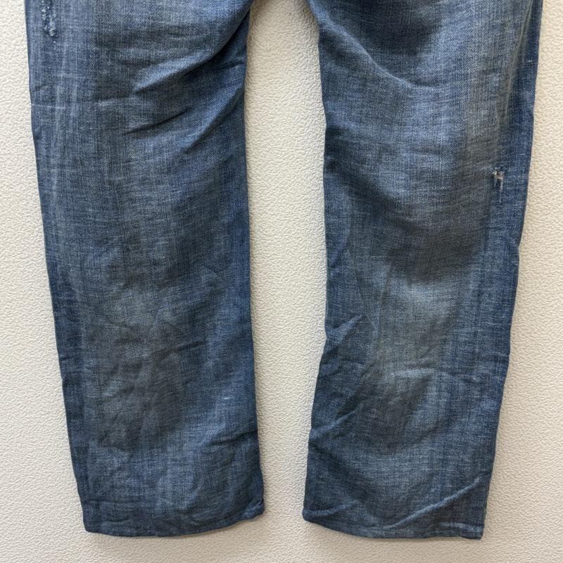 全体に汚れやダメージあり。バックポケットのプレートに皮の剥がれや擦れ傷。裾上げあり。