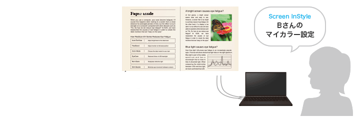 さまざまなユーザーがノートPCを持ち歩き、モニターを共用するフリーアドレス環境において、モニターを使用するたびに自分の好みの設定に細かく変更するのは手間がかかります。EV2460は、無償ソフトウェアScreen InStyleでその問題を解決。Version 1.1.4にて、好みの表示設定をソフトウェアに保存できる新機能を追加しました。ノートPCとモニターをUSBケーブルで接続すると、その設定が自動で反映されます。フリーアドレスでも、手間なく、自分の好みの設定で快適に作業できます。