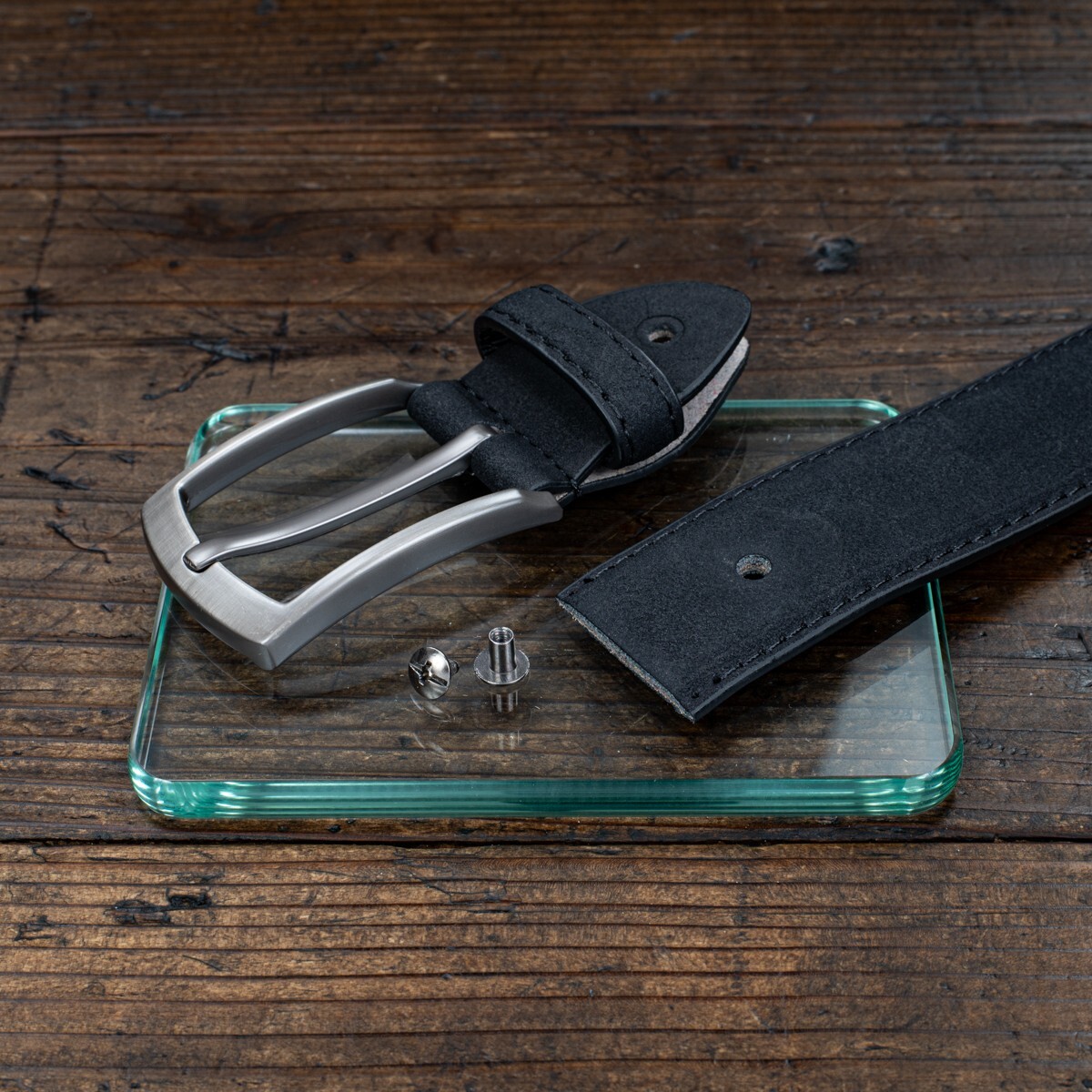 バックルは亜鉛合金製で、シンプルでクセのない形状です。マットなシルバーカラーが黒革と調和し、ビジネスからカジュアルまで幅広い服装に自然に馴染みます。派手さを抑えたソリッドな質感は、大人の装いを引き締める仕上がりです。