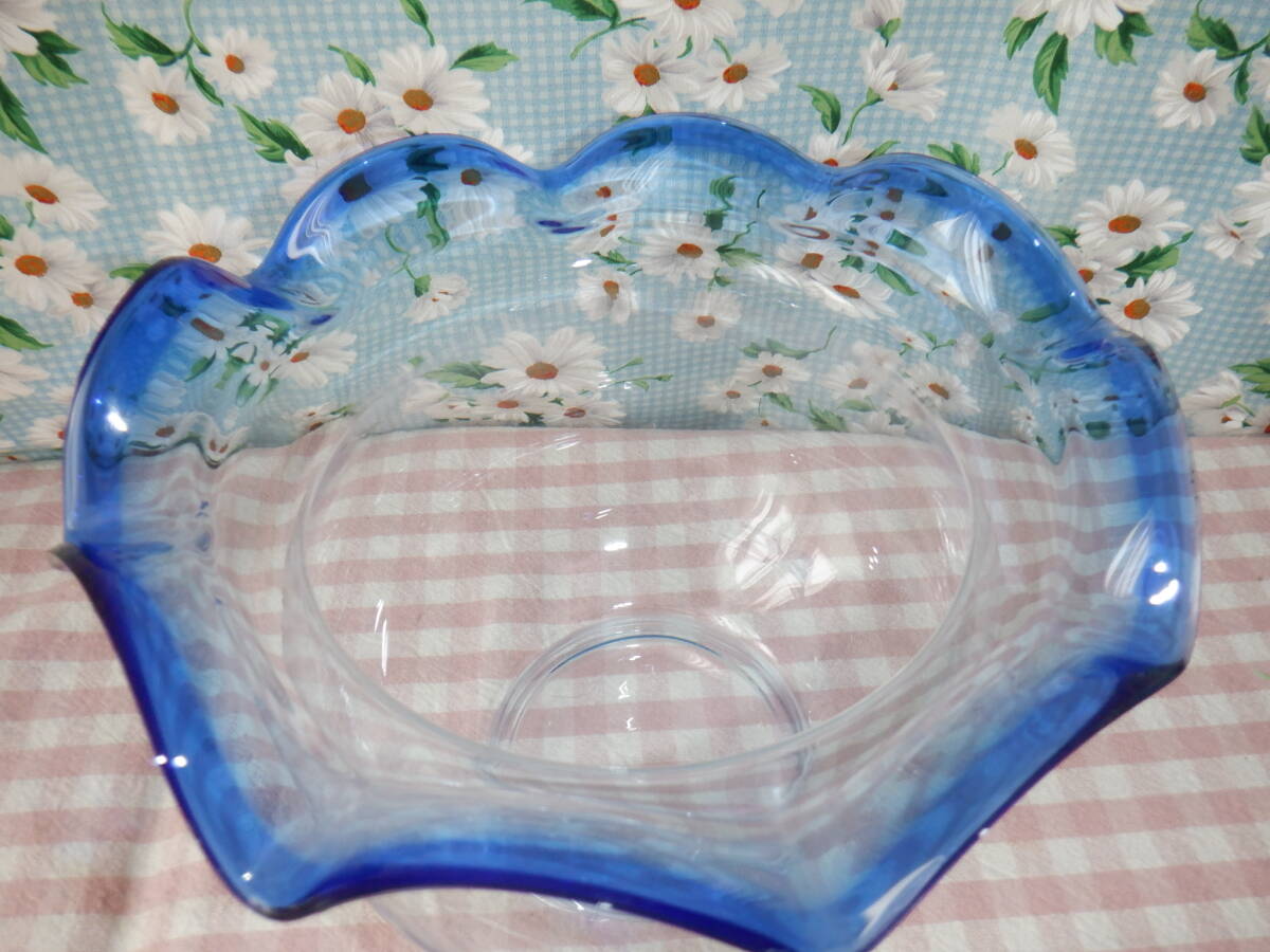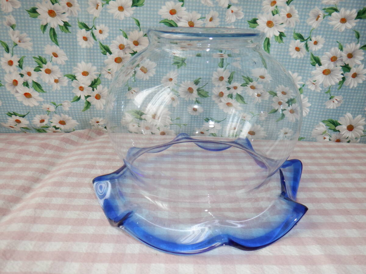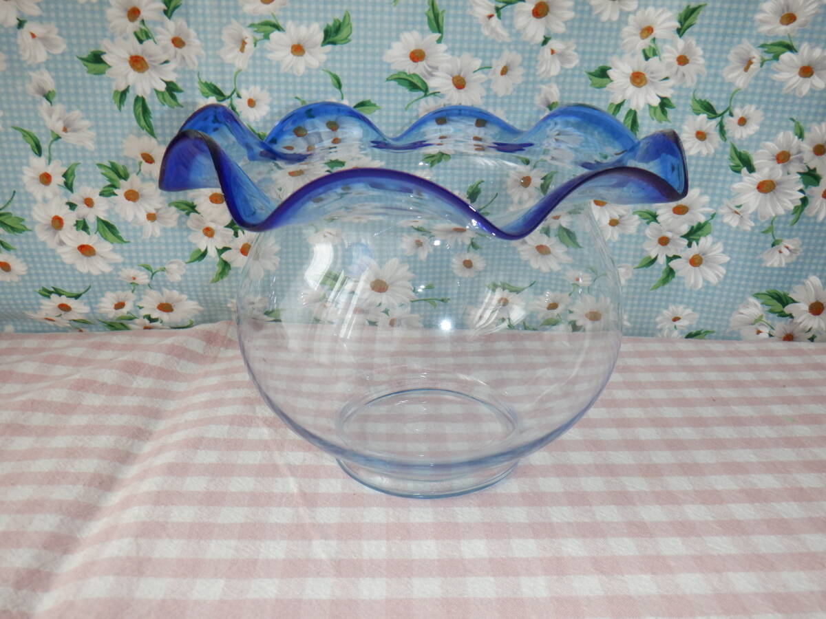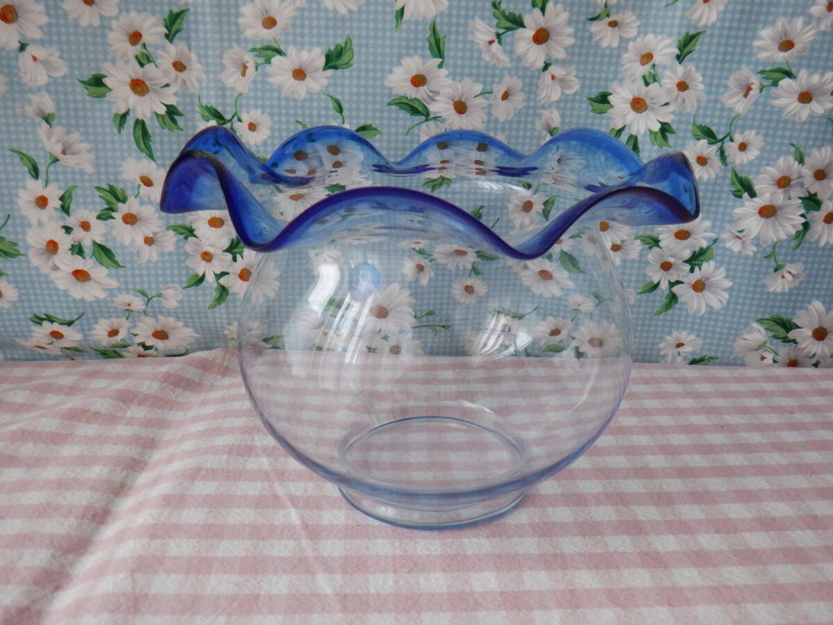 『ガラス製 ブルーの縁どりの金魚鉢 手づくり 高さ16cm』~箱なしです。金魚鉢のサイズですが、横幅(最大)21cm、高さ16cmになります。採寸の方ですが、多少の誤差はお許し下さい。自宅保管につき現状渡しとなります。ノークレームノーリターンでお願いいたします。神経質な方は、入札をご遠慮ください。新規の方、評価の悪い方の入札は、こちらの判断で取り消しさせていただく場合があります。