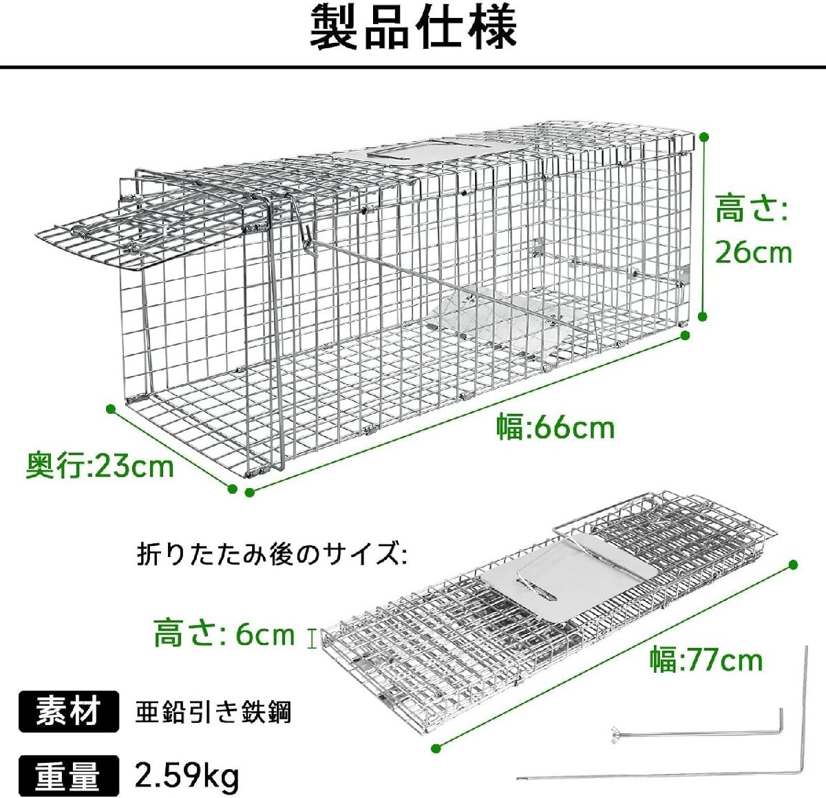 タヌキにぴったり Mサイズ H66cm×D23cm×H26cm畑や庭に設置し、大切に育てた農作物や園芸植物などを動物から守ります。ねずみやタヌキ、野良猫も捕獲できます。また、ペットが迷子になった時の保護する道具としても可能。餌に釣られた動物がプレートを踏めば内部に閉じ込められます。使わない時はコンパクトに使わない時は折りたたんでコンパクトになるので収納場所にも困りません。薬物や毒物は不使用女性でも簡単に組み立てられる折りたたみ式動物愛護法や鳥獣の保護及び管理並びに狩猟の適正化に関する法律(※鳥獣保護ノ狩猟ニ関スル法律)に準じてお使い下さい。〔商品詳細〕本体サイズ:約H66cm×D23cm×H26cm折りたたみ時:約H77cm×D23cm×H4.5cm重量:約3kg捕獲可能動物(参考):野良猫 アライグマ タヌキ ハクビシン イタチ ネズミ テン