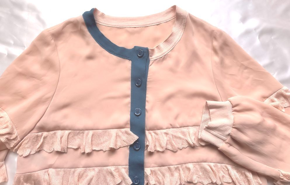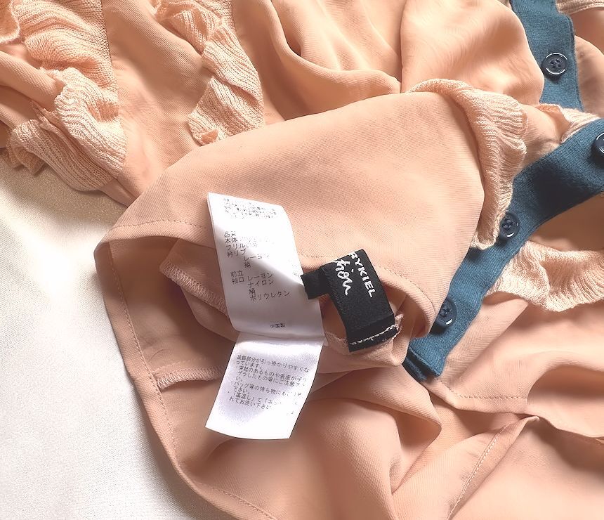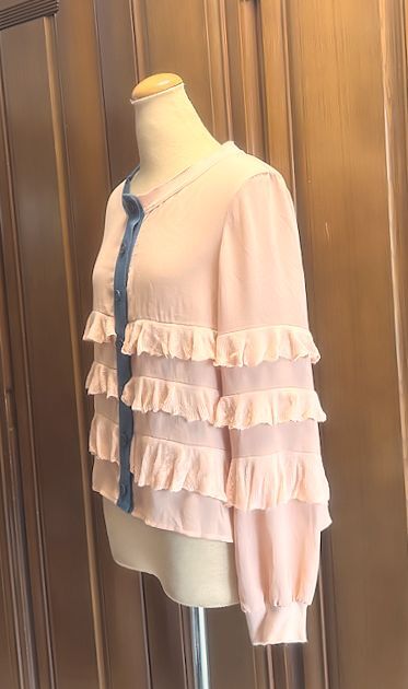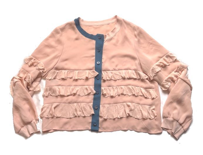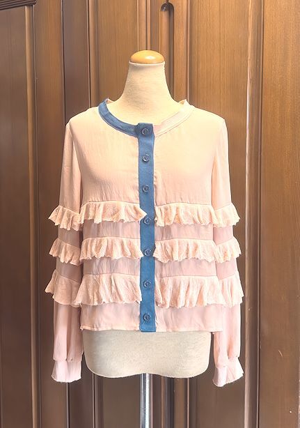 ◎とろみ布帛素材に、レーヨン混コットンのニットをティアード状フリルにしてあしらった、ソニアらしい素敵なデザインです。フロント・フルオープンのため、ブラウスとしても、カーディガン・ジャケット代わりに羽織ってもいいですよ。大切にしておりましたがブラウスの整理中で、いかがでしょう★