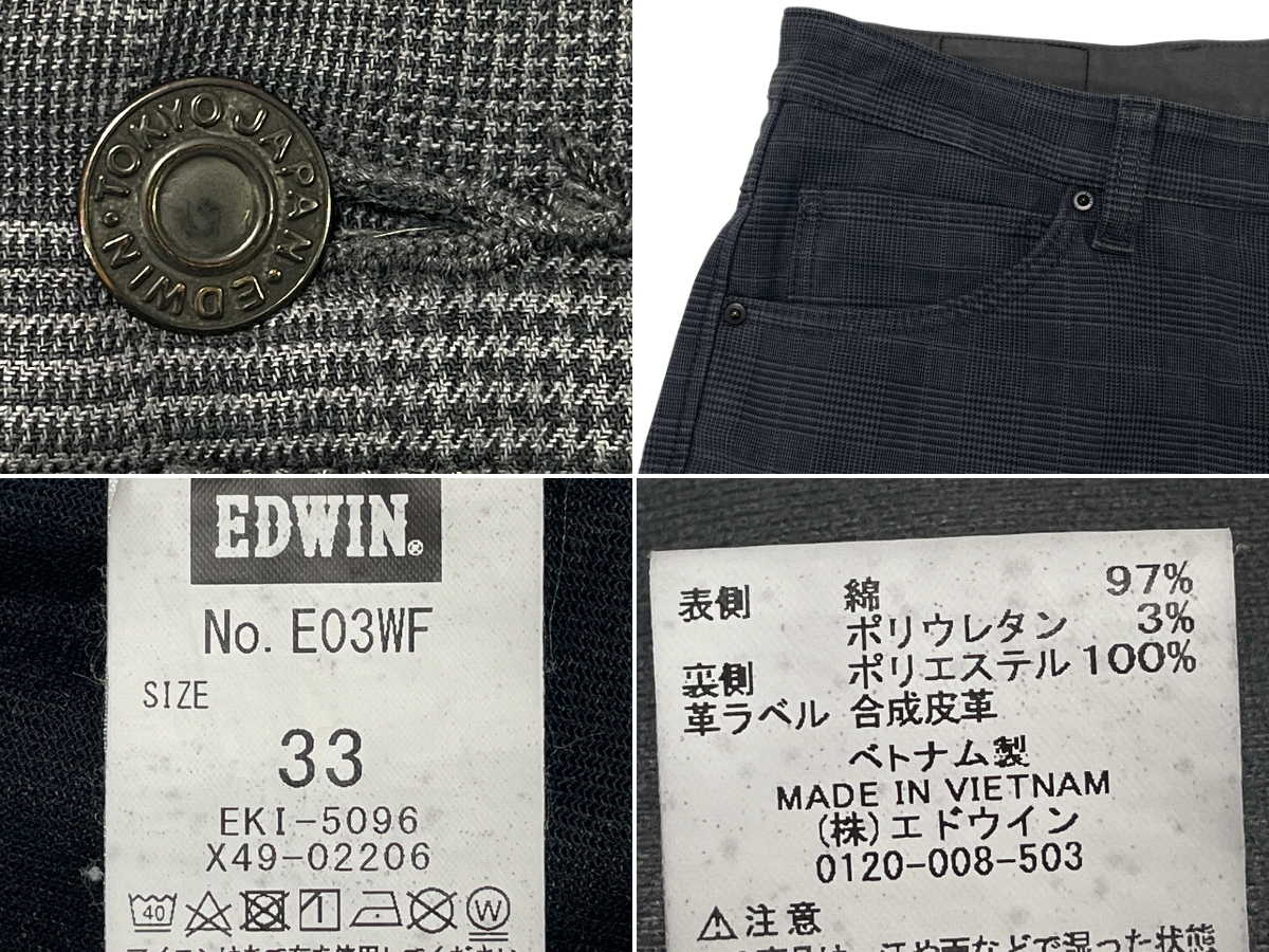 ブランド:EDWIN 型 番 :E03WF カラー :グレンチェック 状 態 :USSD EDWIN 503 ワイルドファイア グレンチェック柄 デニムパンツ です。 防寒性を備えた、あったか ストレッチ パンツ です。ベーシックなレギュラーストレートシルエット。グレンチェック柄なので、幅広い着こなしに対応できるパンツです。 多少の使用感は有りますが、ダメージ無くキレイな状態です。お探しの方勧めの1本です。 ■サイズ:製品表記 W33 ■サイズ:実寸(平置き) ウエスト 43.5cm (×2=約87cm) W34相当 股下 78.0m 股上 27.0cm ワタリ 31.5cm すそ幅 19.5cm | ||