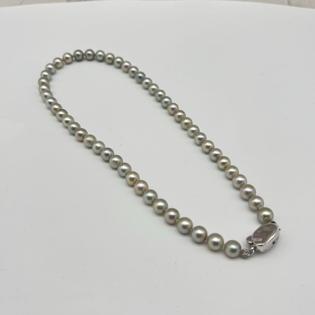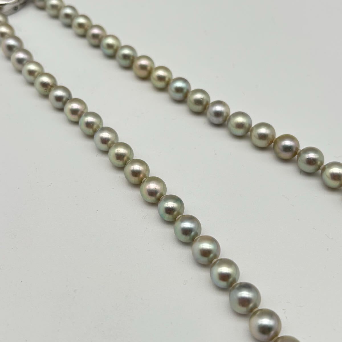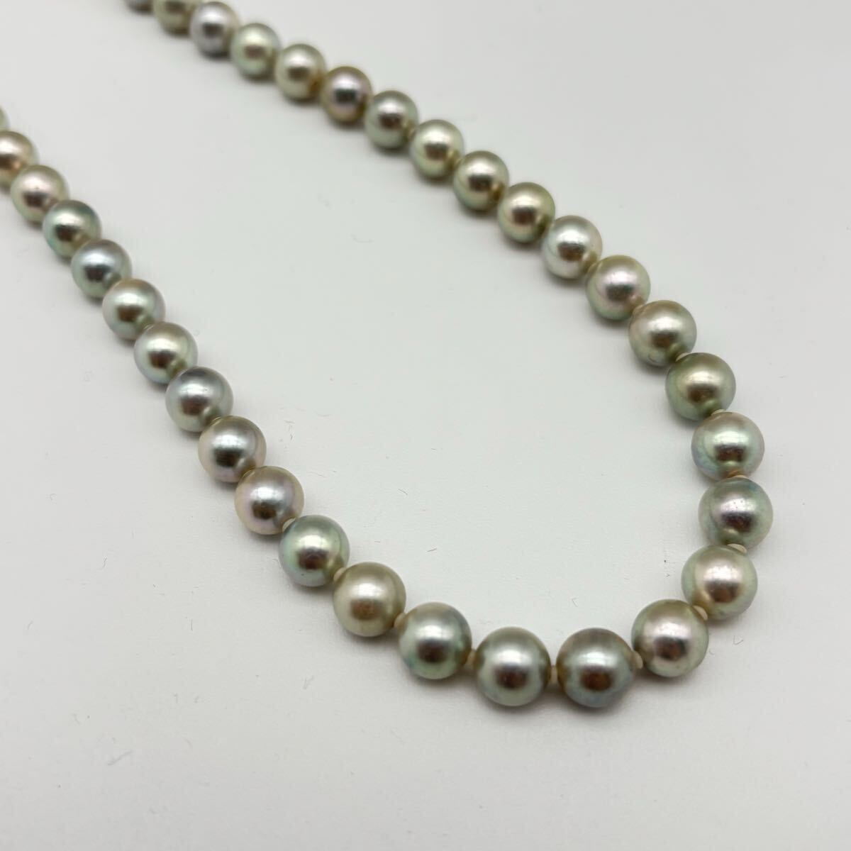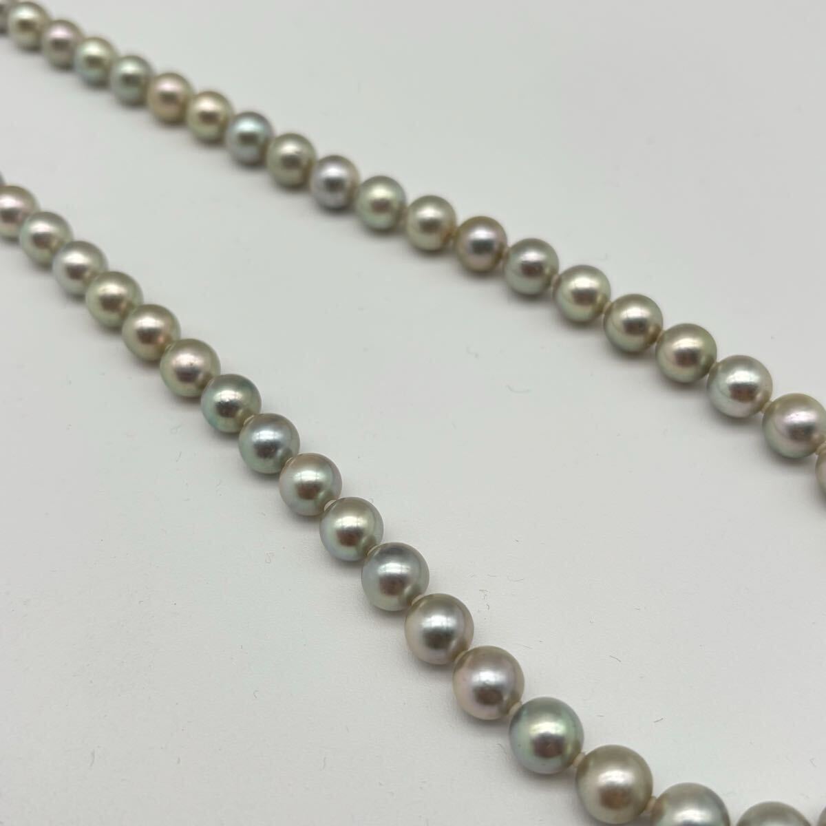 ブルーグレーのような色味でやわらかな多色の干渉色が美しい真珠ネックレスです。