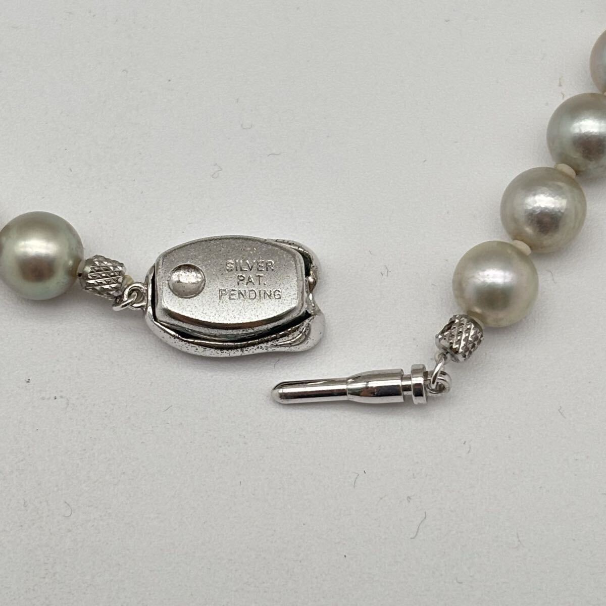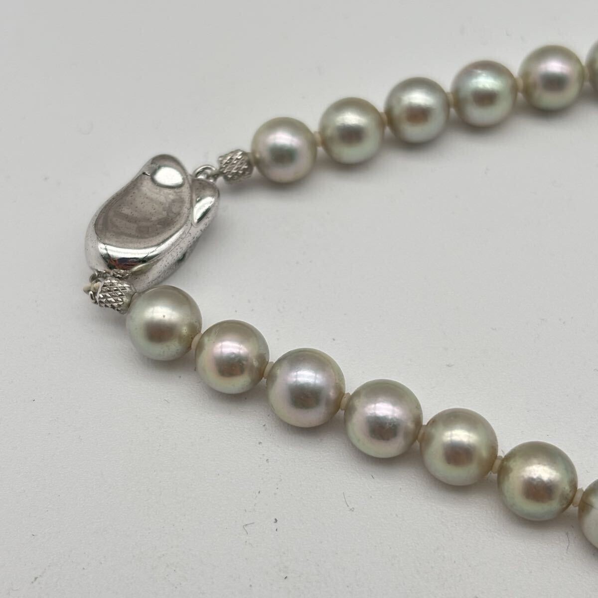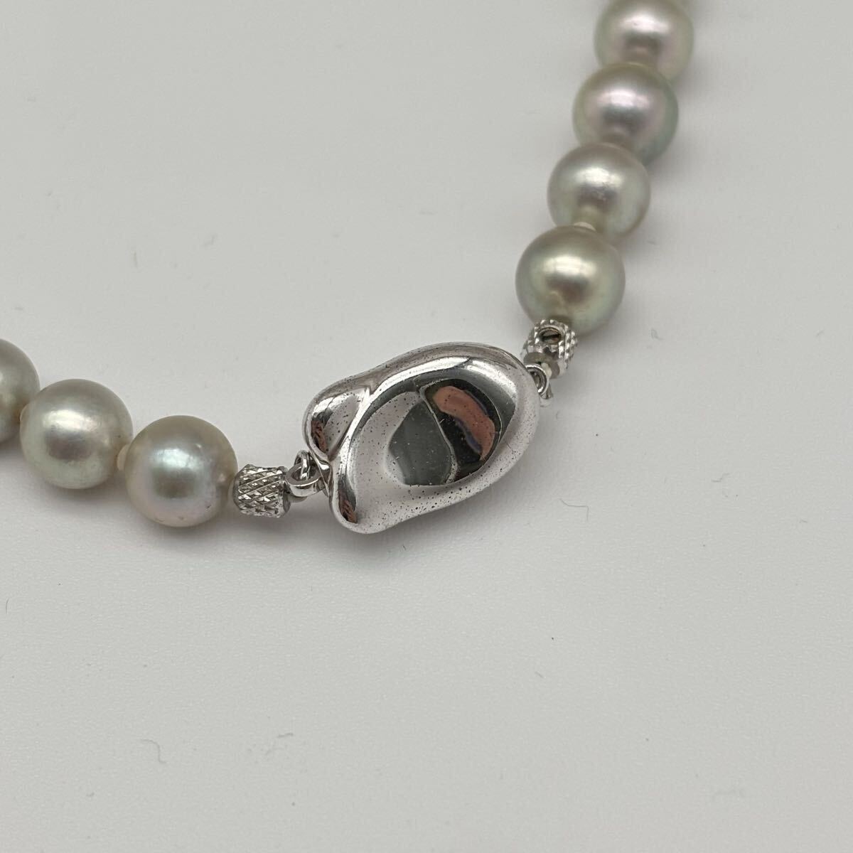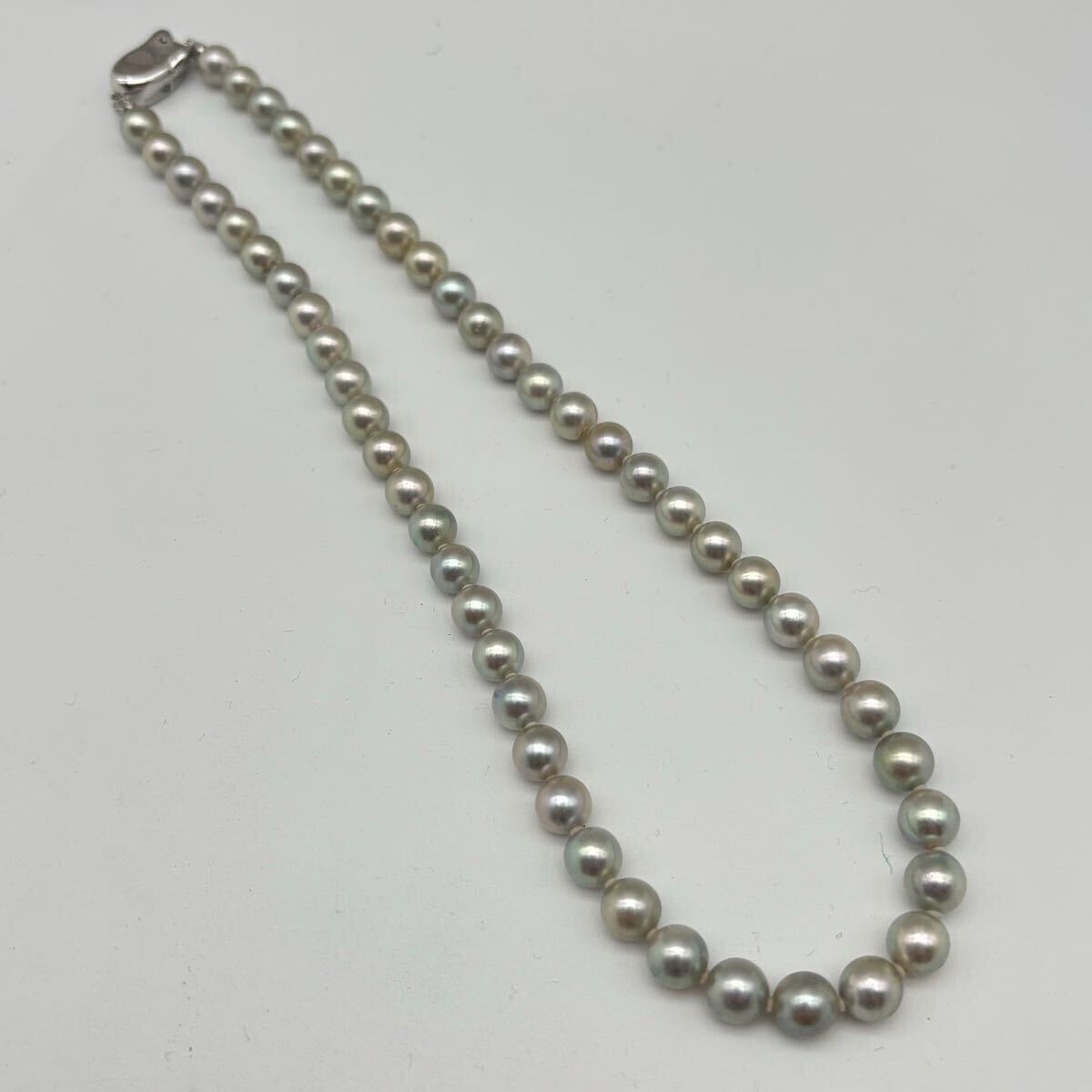 ブルーグレーのような色味でやわらかな多色の干渉色が美しい真珠ネックレスです。