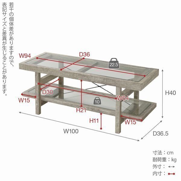 【カラー】 ナチュラル 【サイズ】 <外寸> 幅100×奥行36.5×高さ40cm <内寸> 天板:幅94×奥行36×高さ40cm 中央収納部:幅64×奥行30×高さ21cm サイド収納部:幅15×奥行30×高さ21cm 脚間:幅64×奥行30×高さ11cm 【材質】 本体:プリント紙化粧繊維板 ガラス:5mm厚強化ガラス 【耐荷重】 天板:22.5kg以下 固定棚:10kg以下 【生産国】 中国 【梱包】 サイズ:107×38×14cm、重量:16.8kg 【その他】 ・脚裏フェルト付き 【組み立て品】 お客様による組み立てが必要です。 【ご注意】 サイズ、重量は概算です。 |