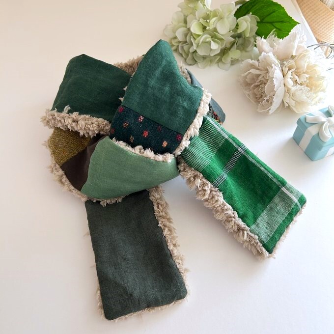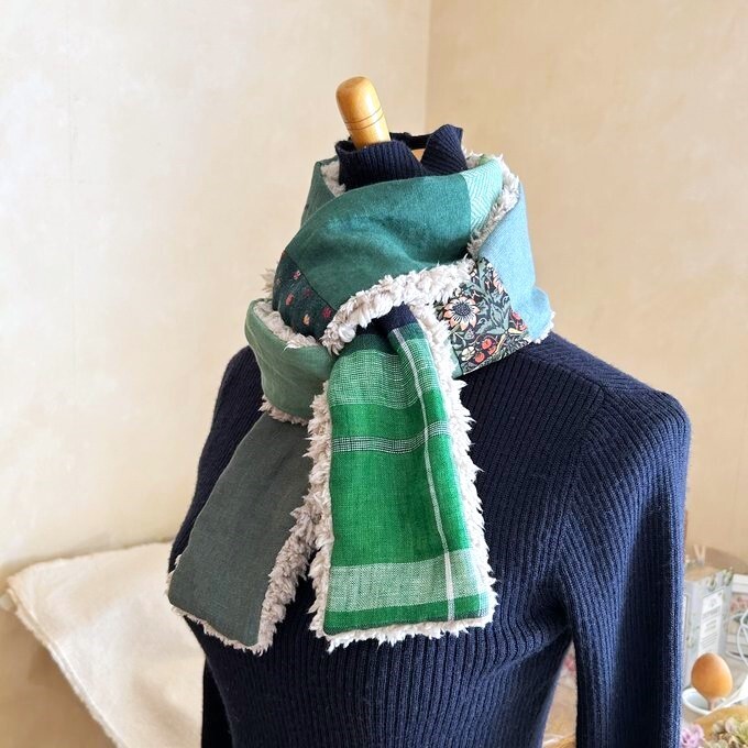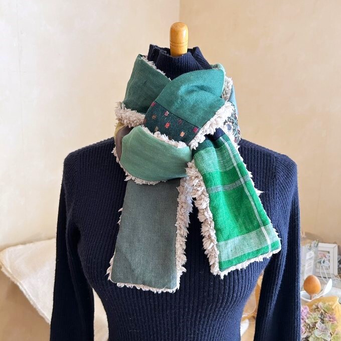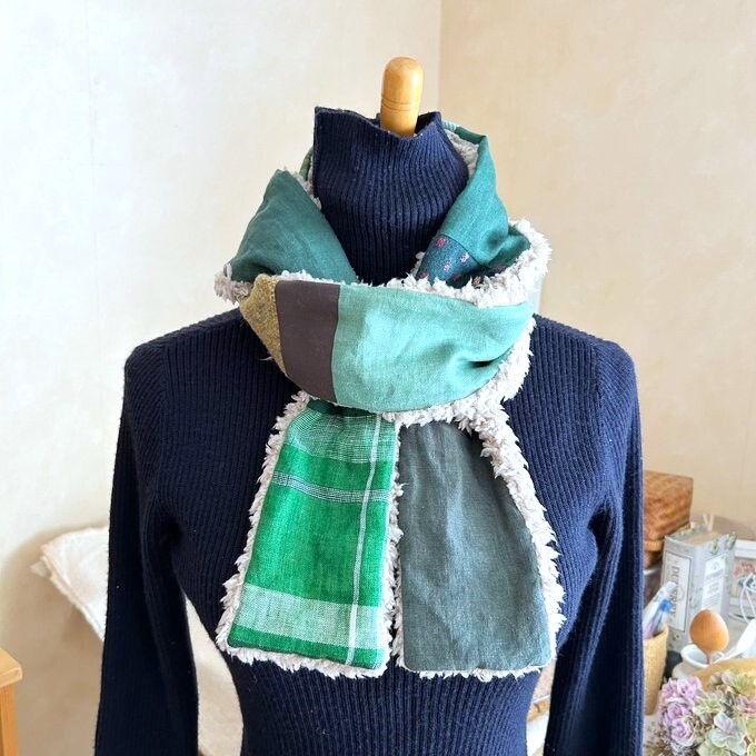 3リネン*パッチふんわりあったか大人乙女のロングマフラー*色々な国のグリーン系リネン*ベルギー*ドイツ*コットンリネン*モスグリーン