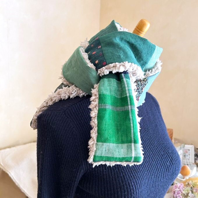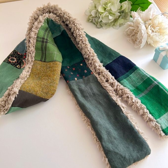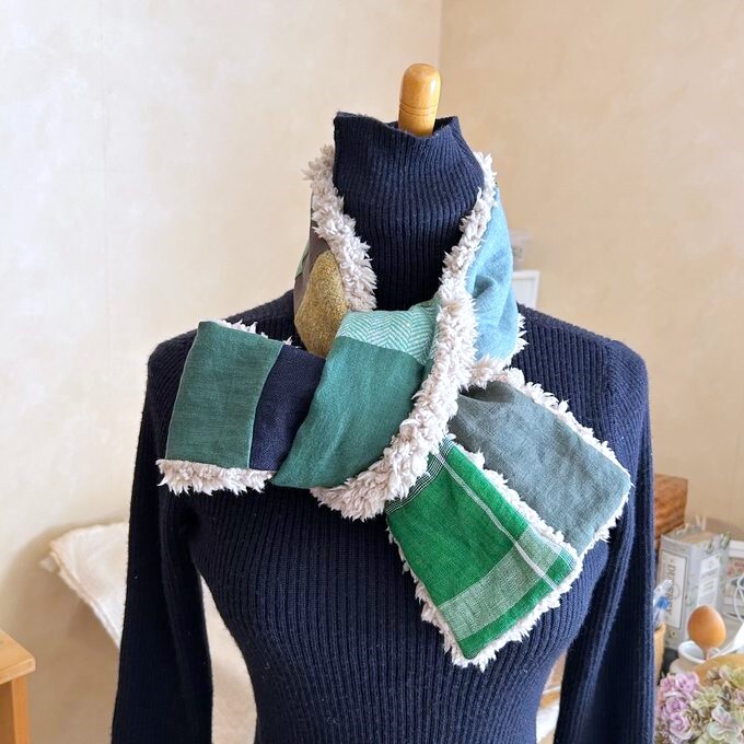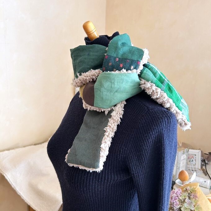 グリーン系ファブリックを色々パッチしてプードルボアとでロングマフラーを作ってみました