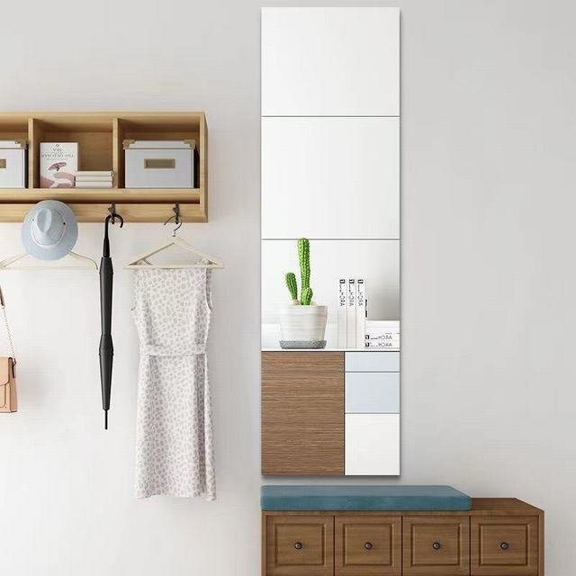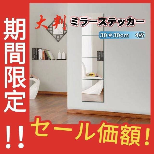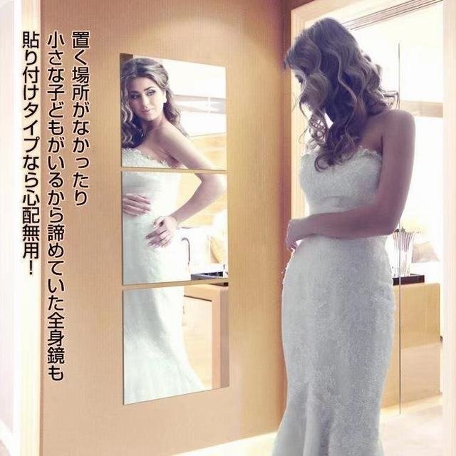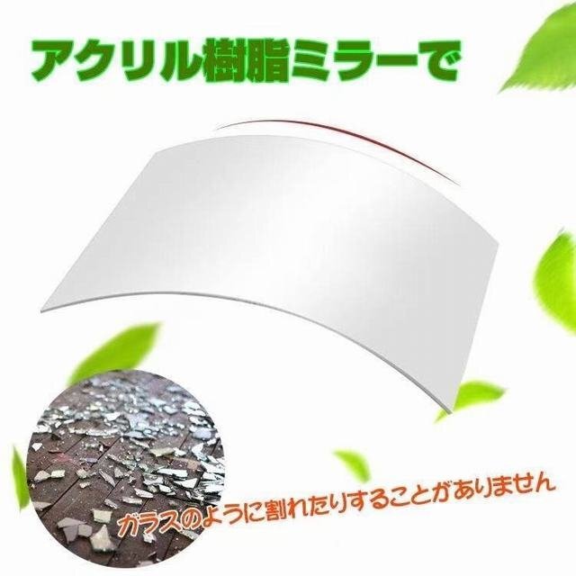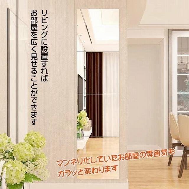 大判ミラーステッカー 4枚セットです。貼り付けが完了後,表面のシートを剥がしてご利用ください。 貼るだけの簡単設置なので場所を選ぶことなく様々な空間にてご利用頂けます。インテリア感覚で貼ってもオシャレです。 壁に穴をあけたりする必要もないので傷の心配もありません アクリル樹脂ミラーでガラスのように割れたりすることがありません。 ※紙製のクロスや繊維壁、塗装面、砂壁などのデリケートな面への貼り付けは避けて下さい。 ※強い力を加えないでください。歪みの原因になります。 ※ガラス鏡に比べて歪んで見えることがあります。 ※改造/本来の目的以外い衝撃などはお控え下さい。 ※仕様は改善の為に予告なく変更する場合があります。
