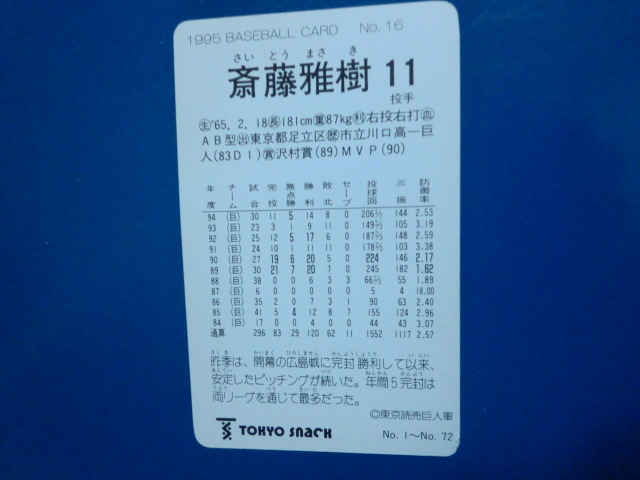 カルビー プロ野球 1995 No.16 斎藤雅樹 東京スナック