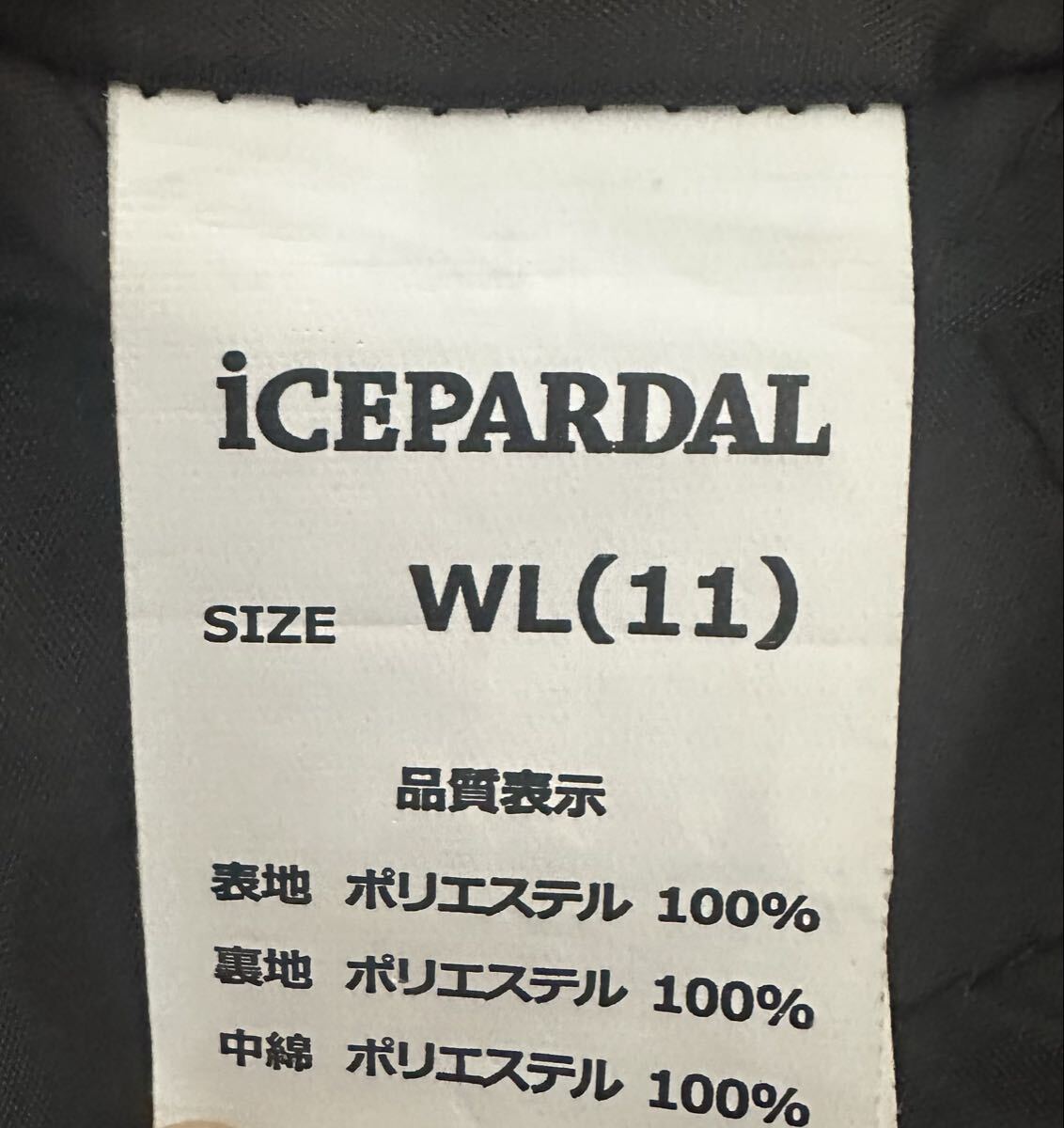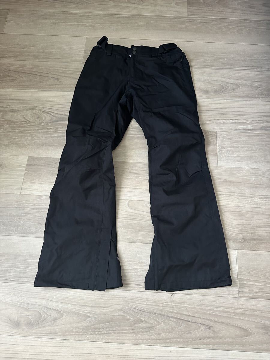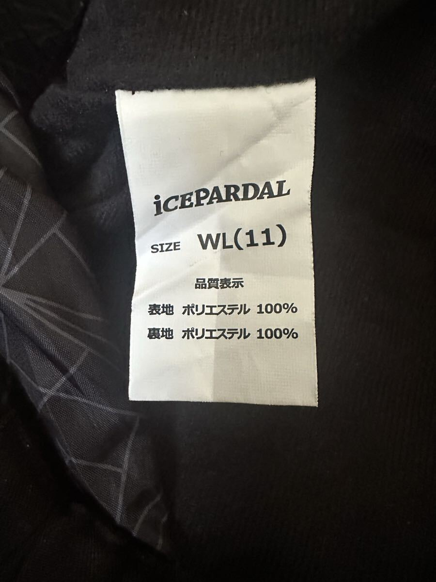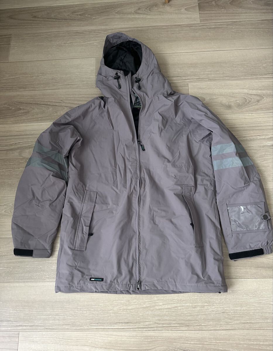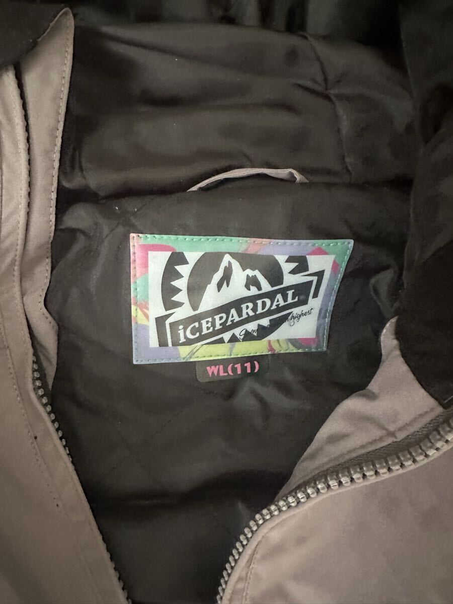 ICEPARDALのグレーのフード付きスノーボードジャケットとブラックのパンツ、耐水性で反射材付き。