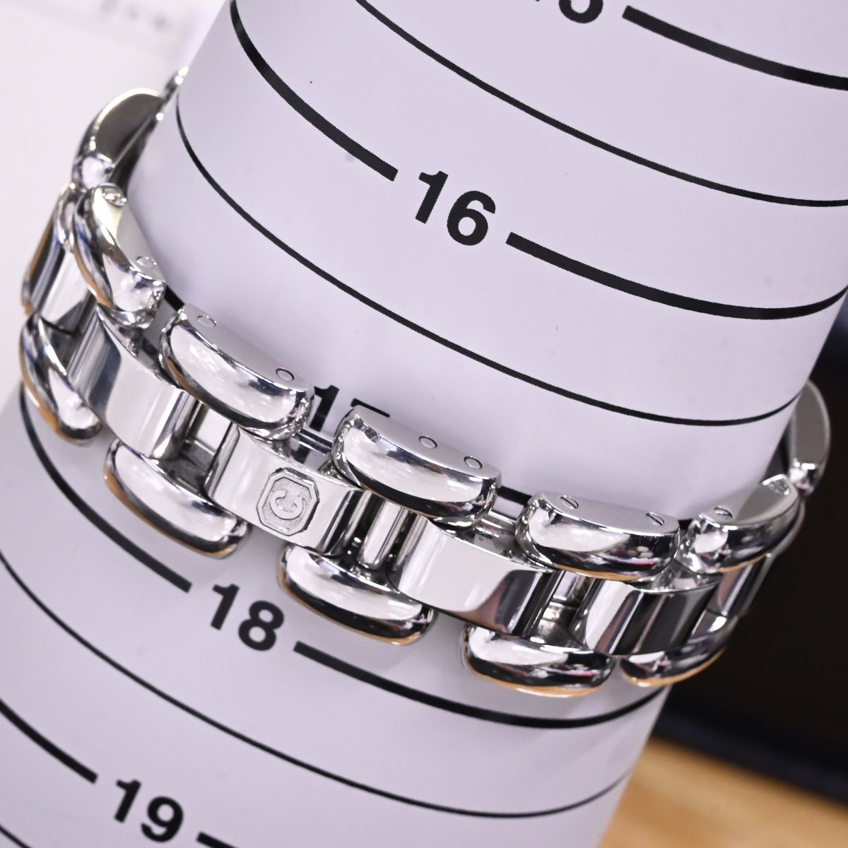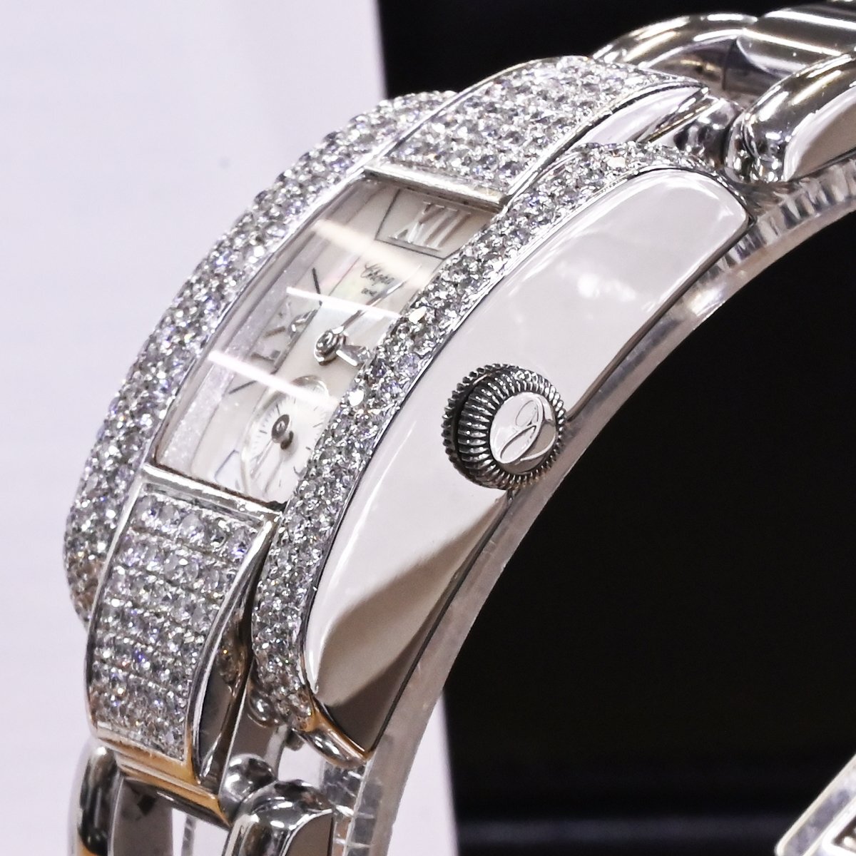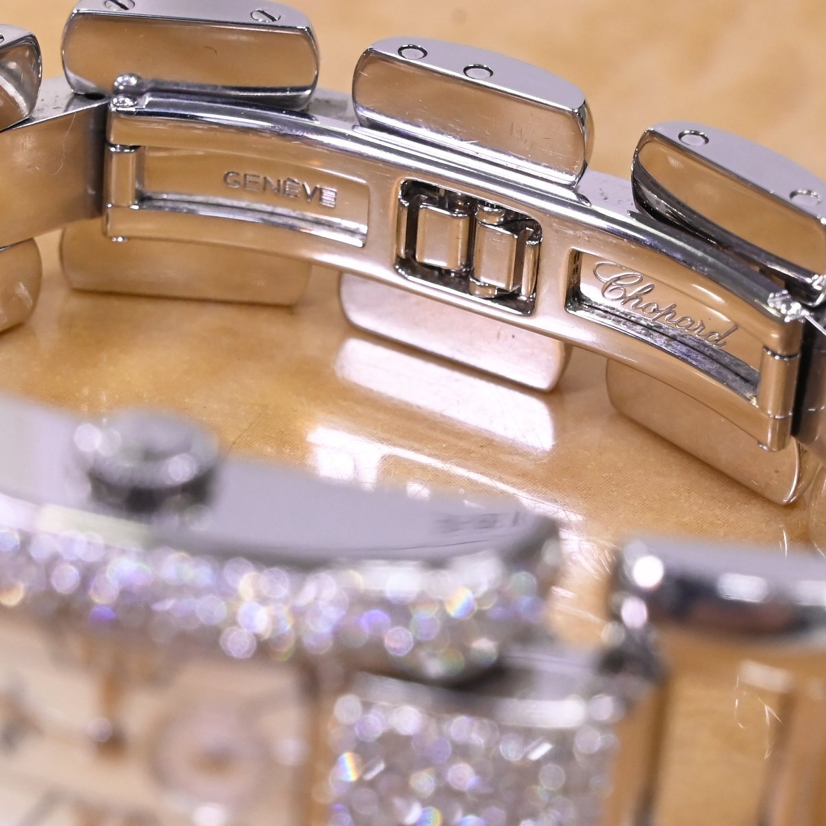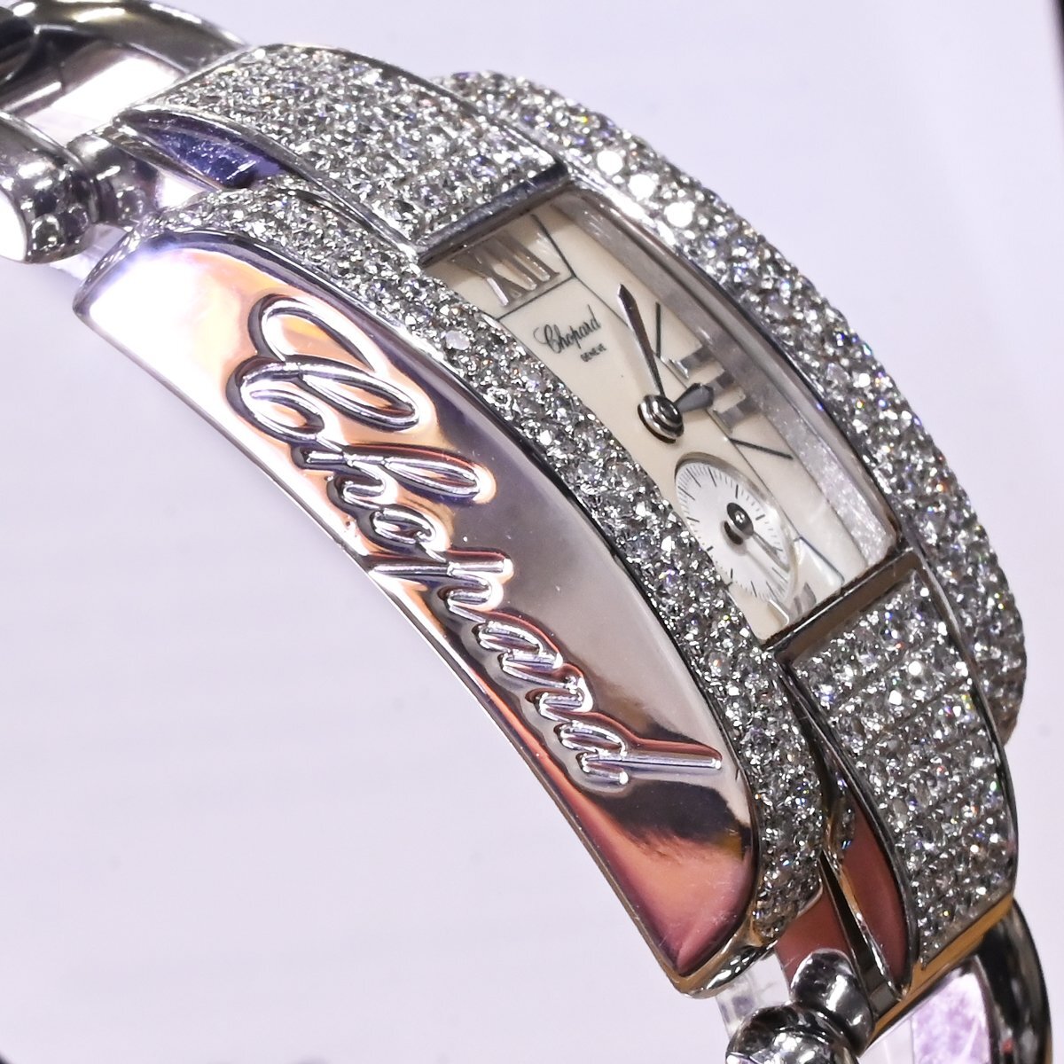 ショパールのフルダイヤ LA STRADAです。 イタリア映画界の巨匠であり“映像の魔術師”の異名を持つフェデリコ・フェリーニ氏の代表作『道(LA STRADA)』から名付けられた時計です。 時計ケースとブレスレットがリンクし一体感を持たせた独特のデザインは、1950年代に銀幕で輝いていたミューズたちへオマージュを捧げたもの。 腕元で存在を主張するボリューム感とイタリアらしい豊かな感性が息づくデザインは、何気ないデイリースタイルにオーラを纏わせます。 市場流通量の圧倒的に少ないモデルなのでお探しの方も非常に多いかと思います。 ※基本動作確認済。 |