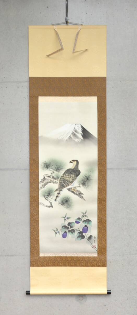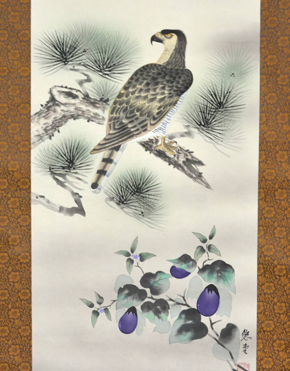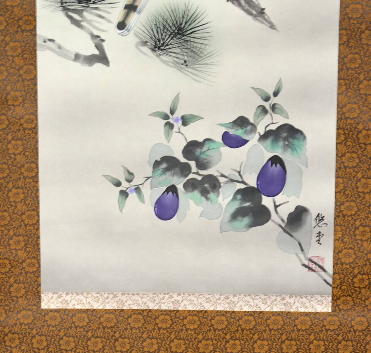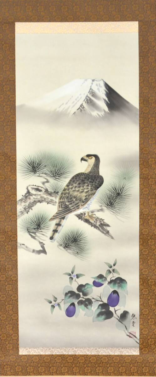 46◆初荷です ◆掛軸 笹原悠堂 彩色一富士二鷹三茄子 真作 絹本 ◆共箱 正月掛 縁起物