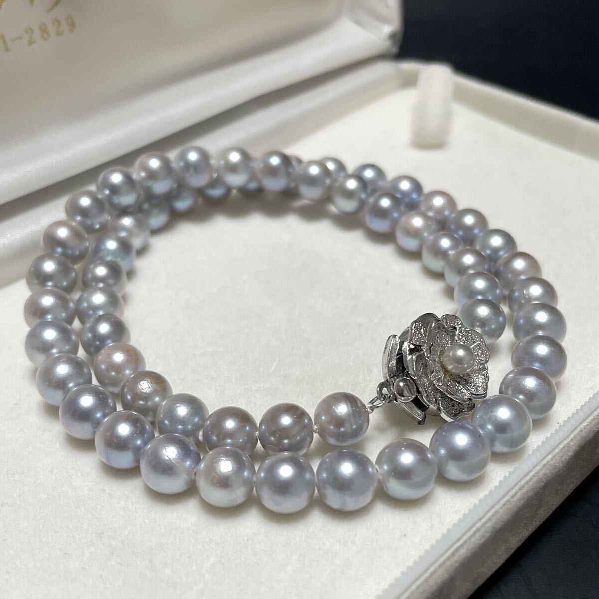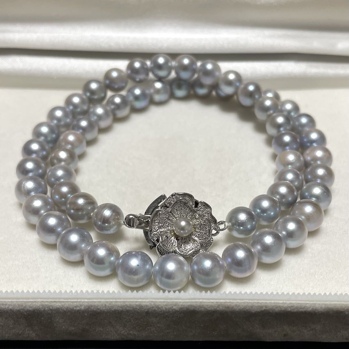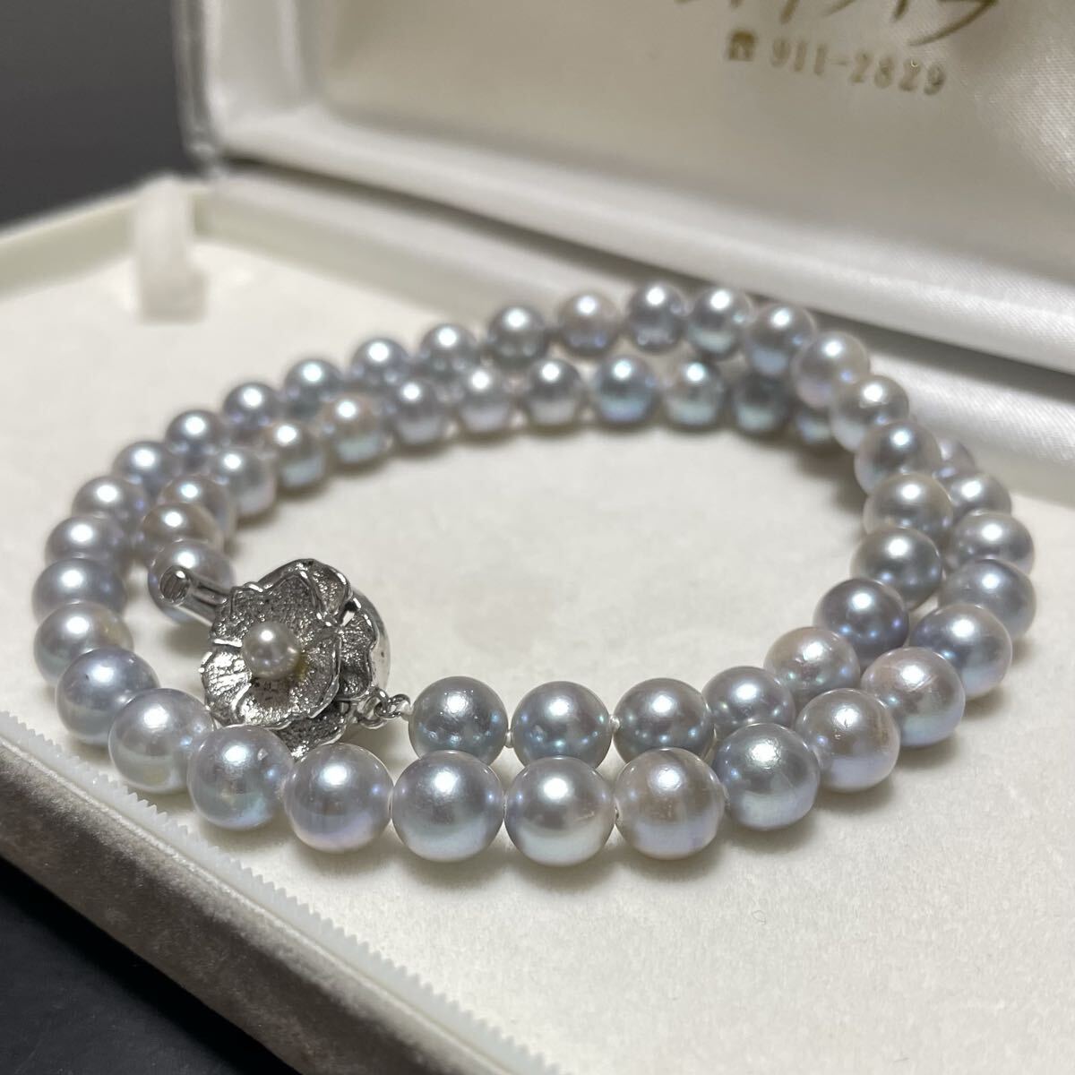 テリ強 花珠級 約7.0-7.5mm 約42cm あこや真珠 本真珠 ネックレス pearl パール SILVER刻印 オーロラ干渉色 シルバー金具 ブルー系 グレー