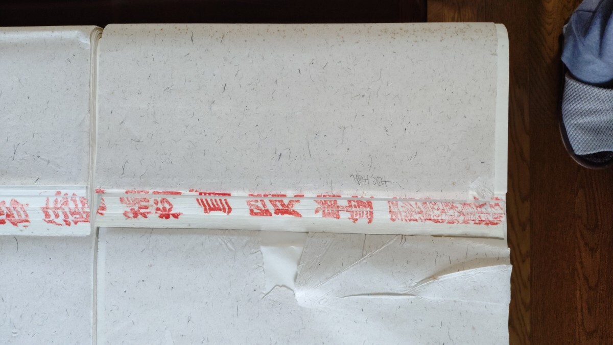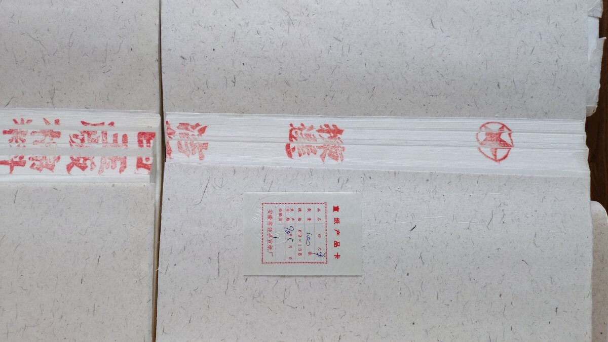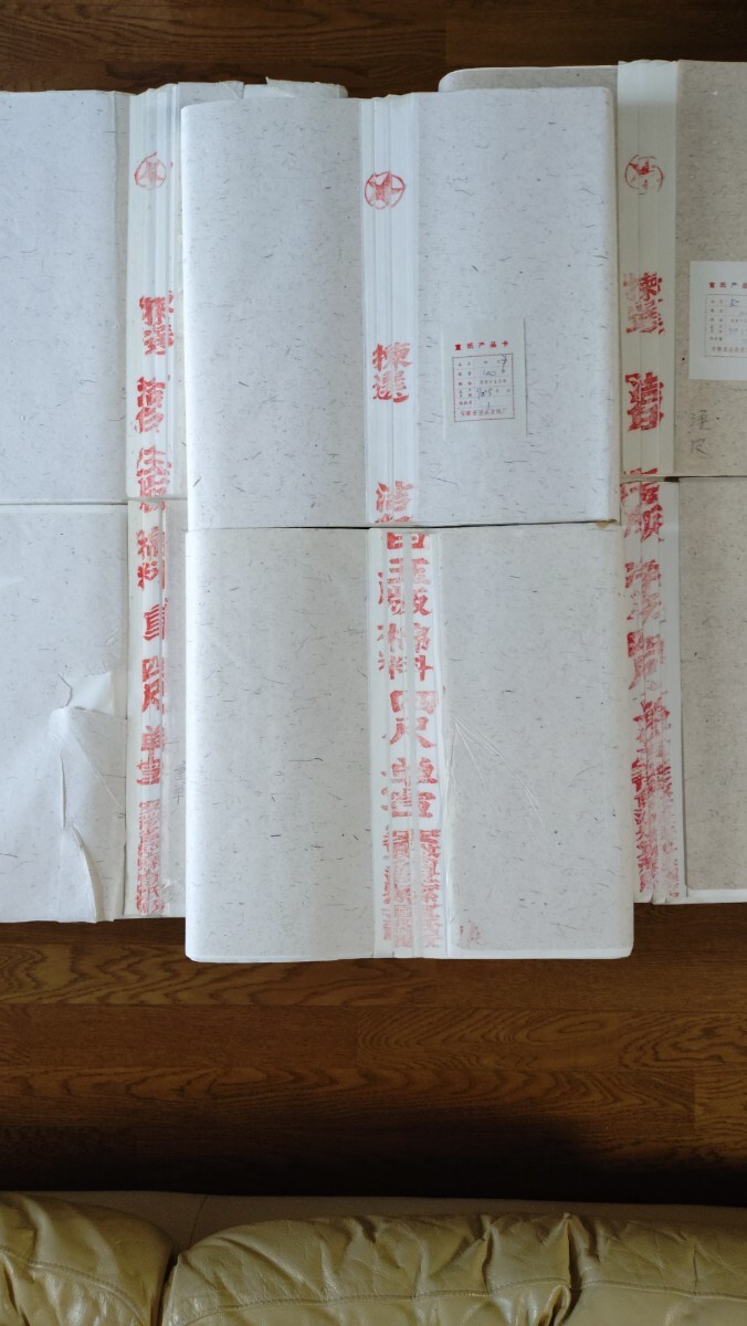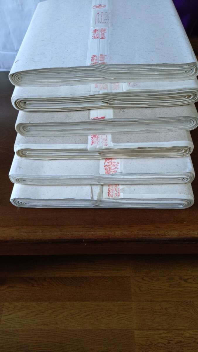 1990年代 東京神田の老舗書道具店「清雅堂」で4尺全紙サイズの紅星牌を「単宣」「浄皮単宣」「重単宣」と三種類をそれぞれ半切サイズに裁断してもらったもので、全紙3反300枚を半切6反600枚になります。