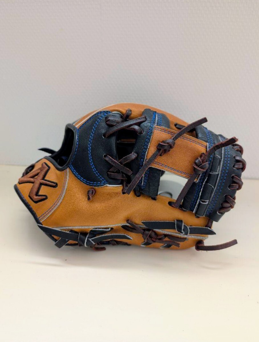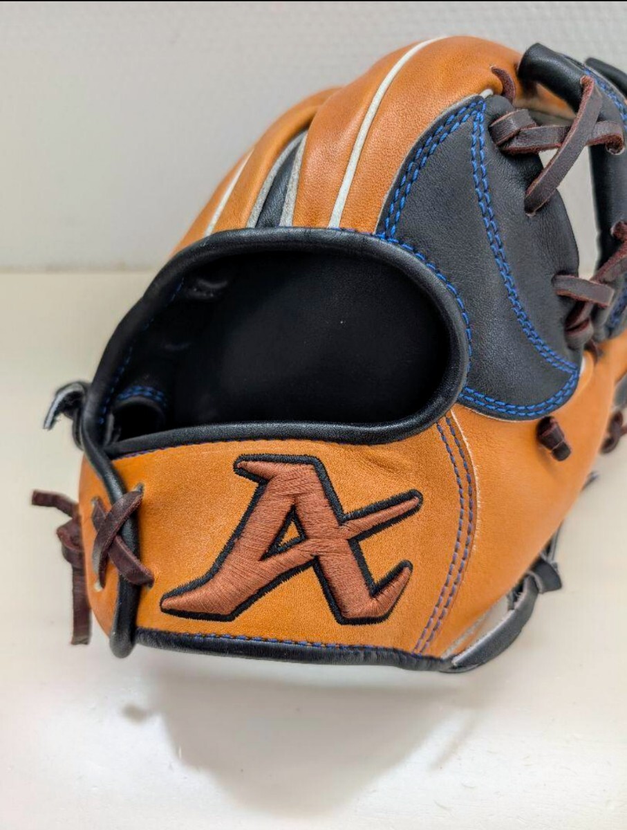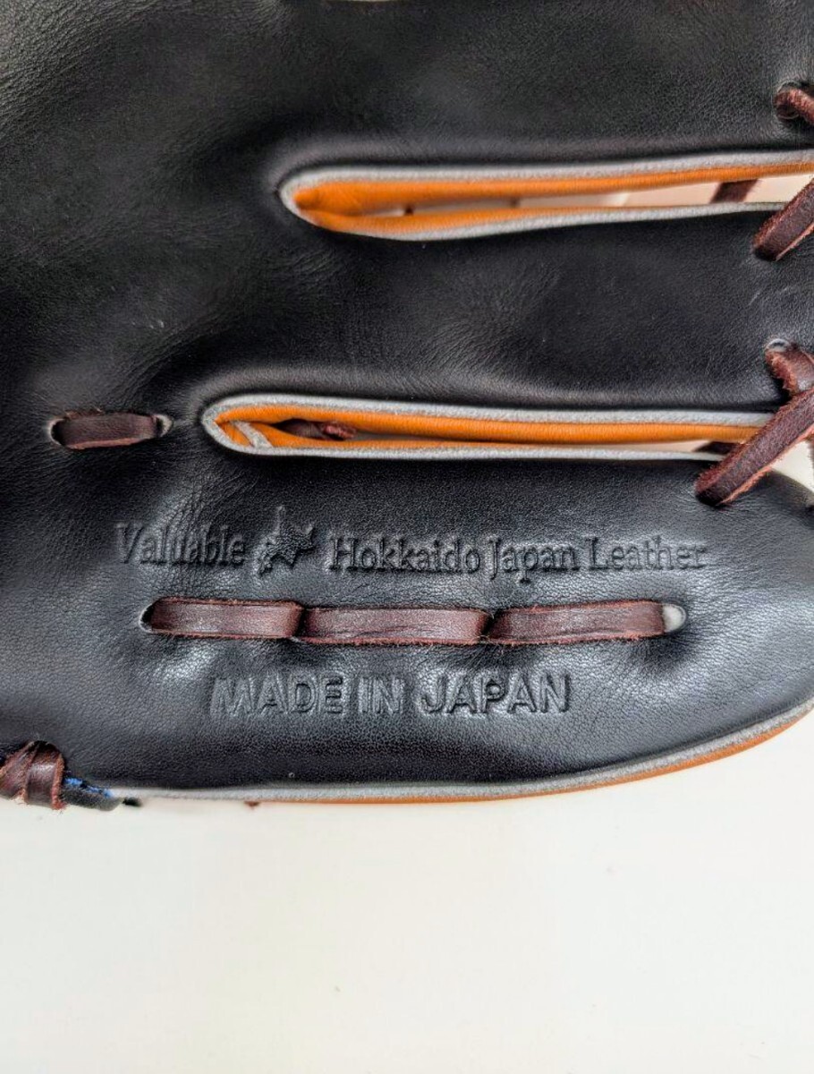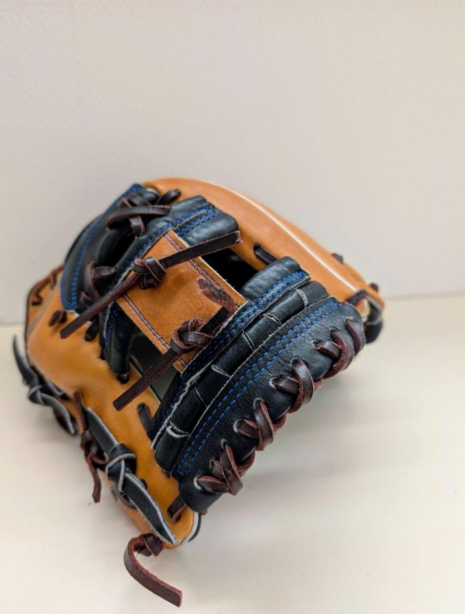 ブラックとブラウンのような色で、ハミ出しは玉ハミのホワイト、ステッチはブルーになります。