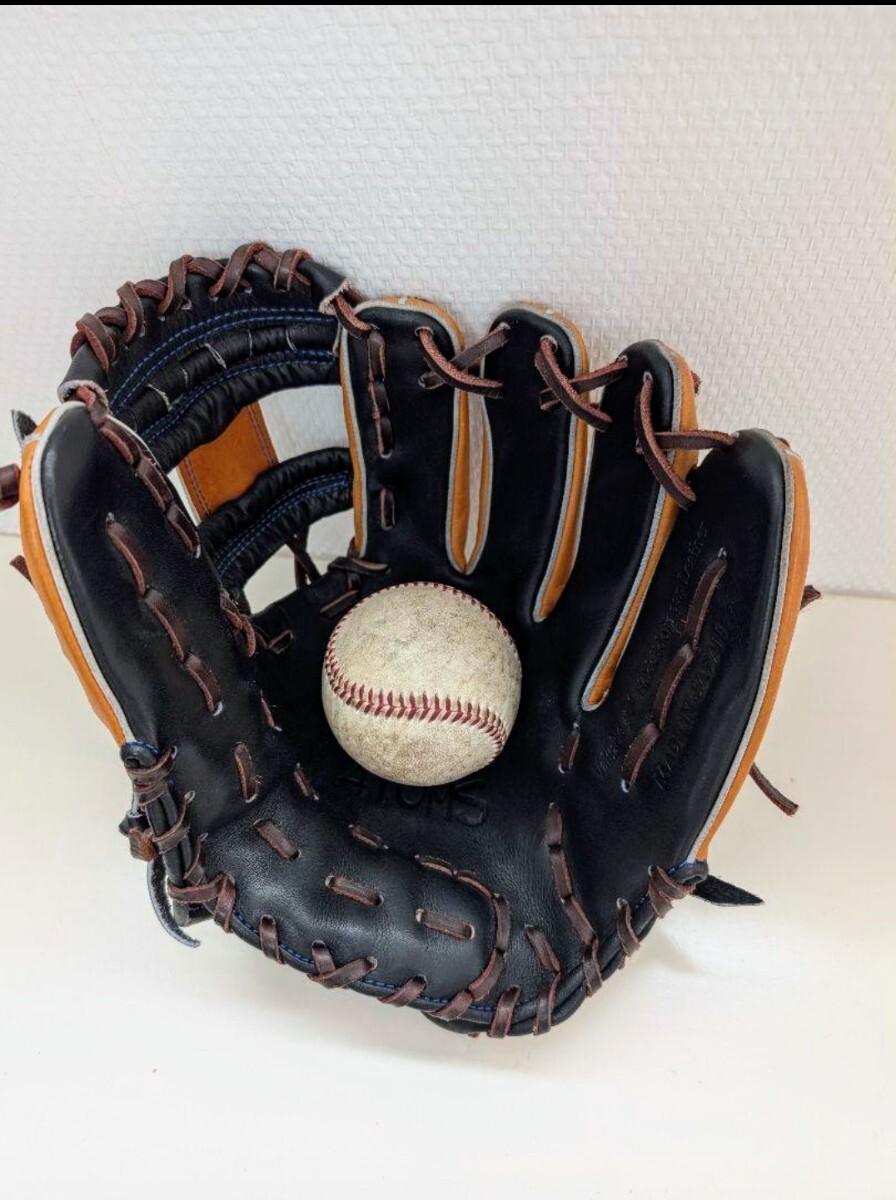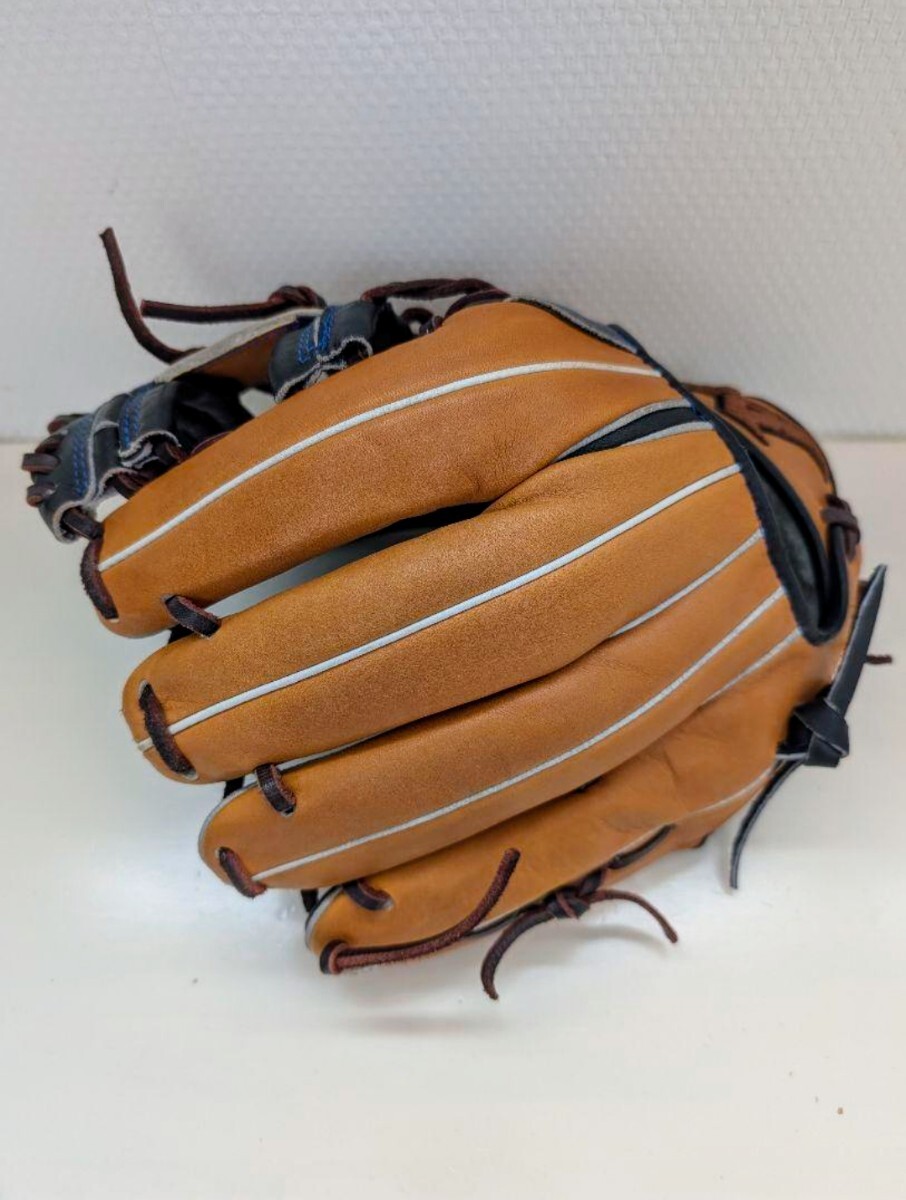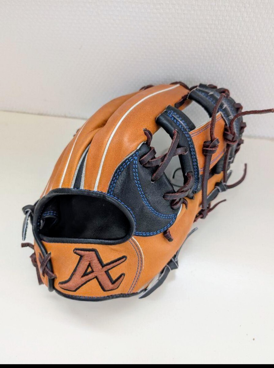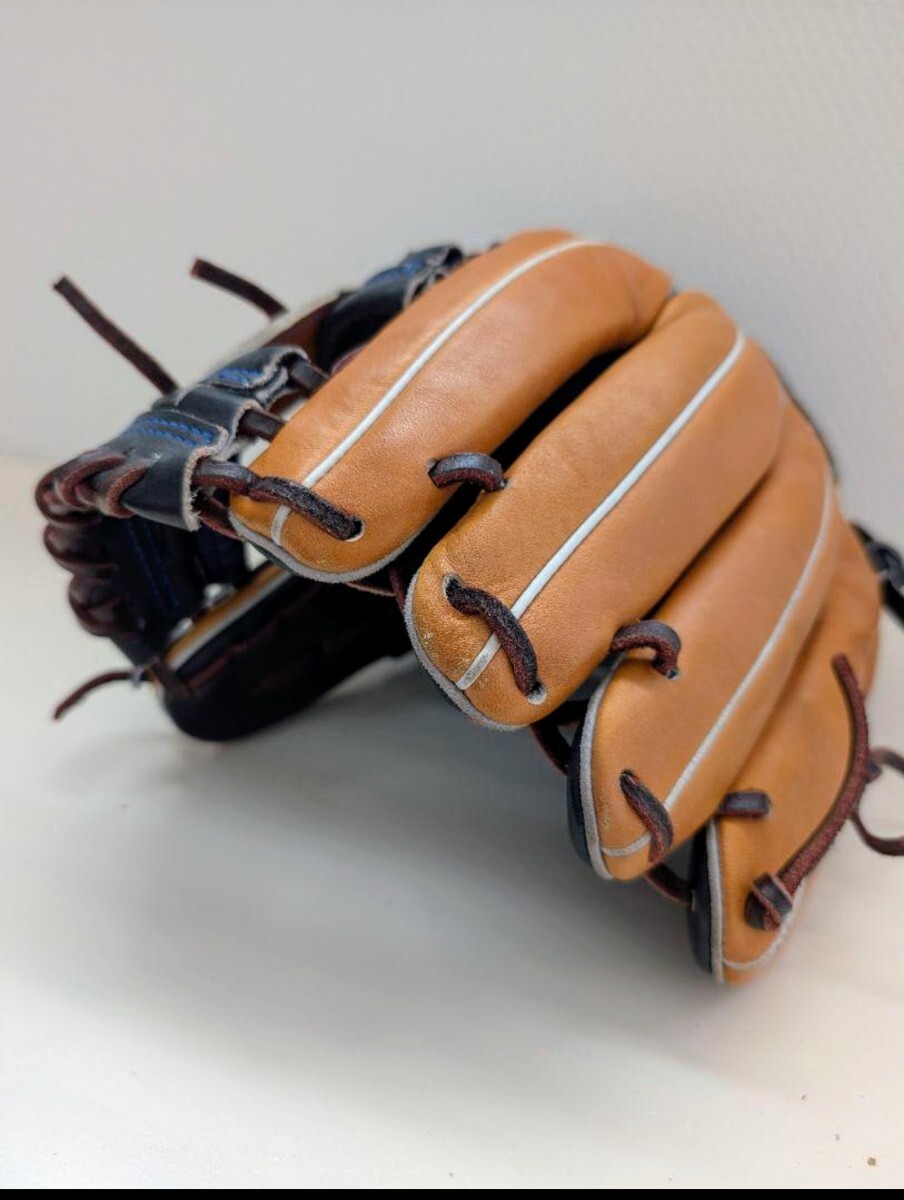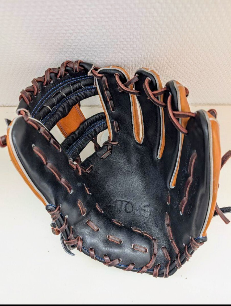 ブラックとブラウンのような色で、ハミ出しは玉ハミのホワイト、ステッチはブルーになります。