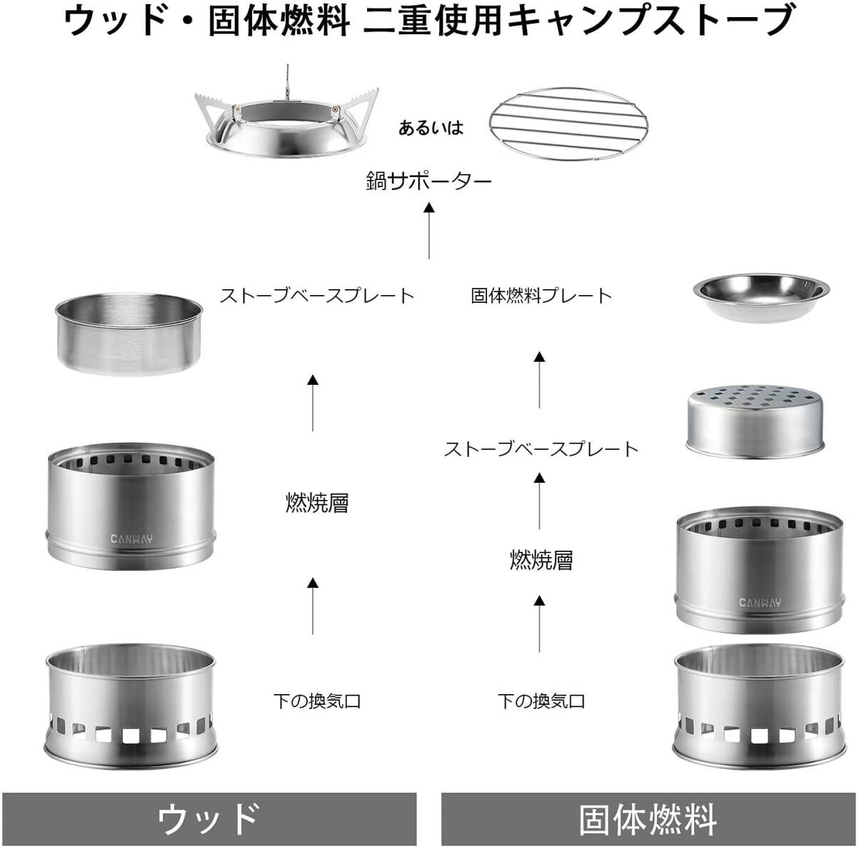 【環境に優しい】ウッドとアルコールの二重使用キャンプストーブ。火吹き棒付きのため、重くて高価の燃料を購入して運ぶ必要はなく、簡単に収集できる枝、葉、薪などを燃料として焚くことができます。ご利用後に、燃えた灰を肥料として土壌に戻すことができます。