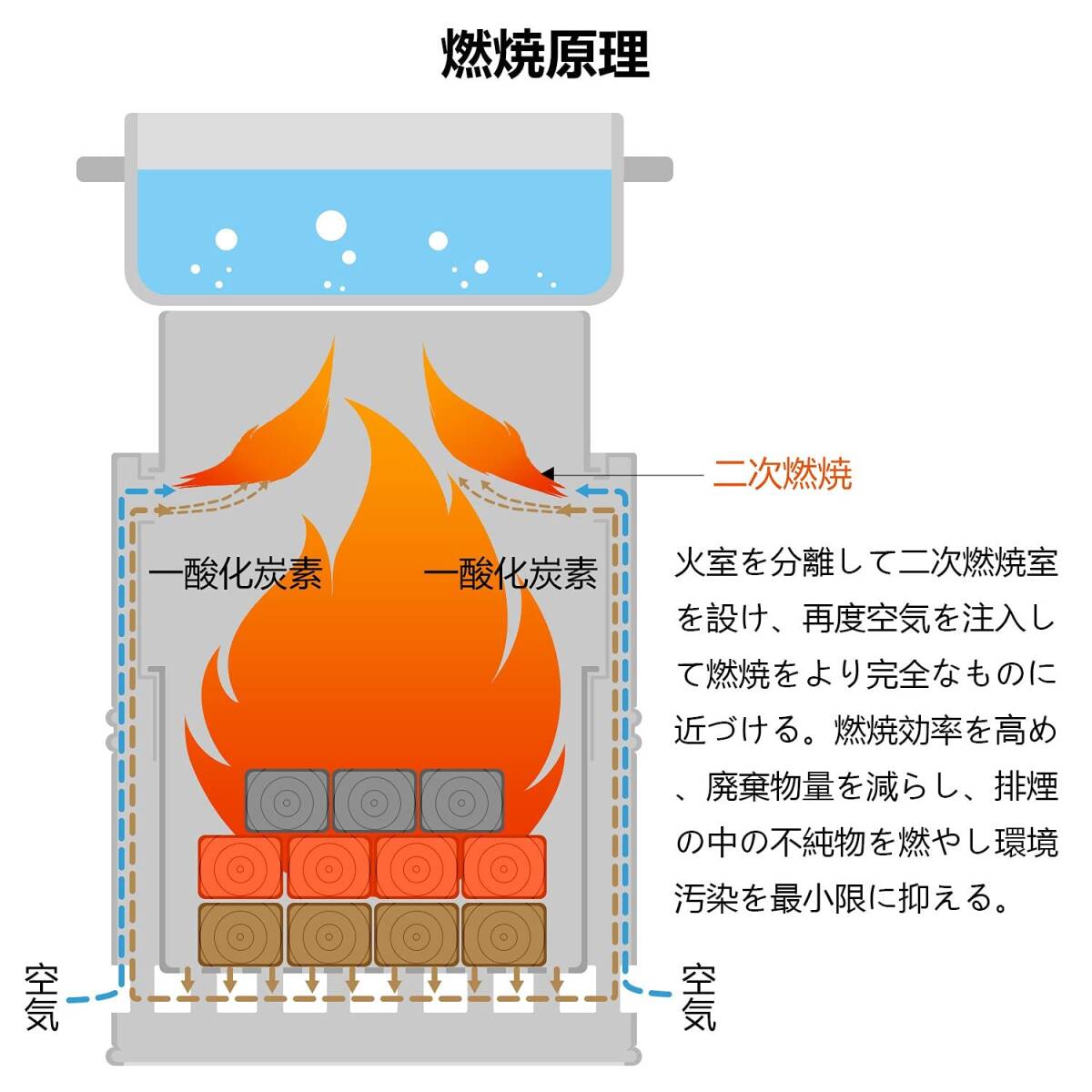 燃焼効率を高め、燃焼によって発生する廃棄物量を減らし、排煙の中の不純物を燃やし環境汚染を最小限に抑えるシステムである。 エネルギーを節約する優れたシステムだ!