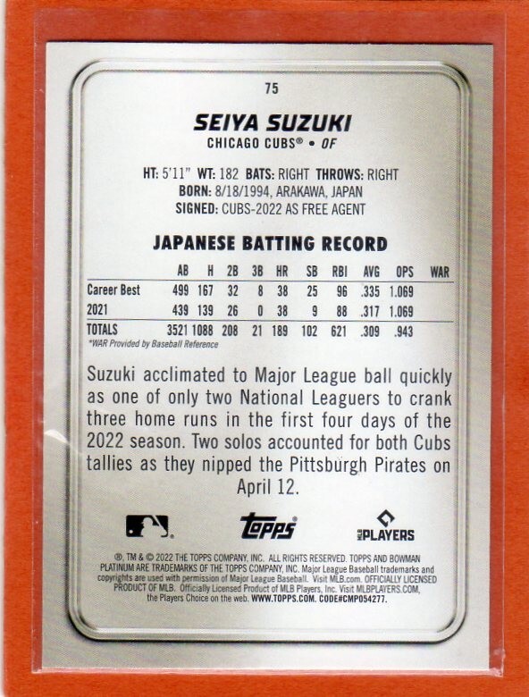 ★商品説明★ | 2022BOWMAN PLATINUM #75 RC 鈴木誠也 MLBルーキー・カード *カードの特徴として、全体に反(そ)りあり 鈴木誠也ファンの方、是非どうぞ! |