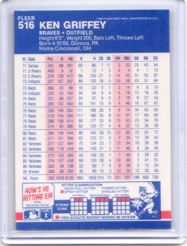 ★商品説明★ | 1987FLEER #516 *表面光沢なし ------------------------------------------------------------ ■ケン・グリフィー・シニア MLB成績 19年 1973-91年 レッズ ヤンキース ブレーブス マリナーズ 2097試合 2143安打 152本塁打 859打点 200盗塁 打率.296 オールスター3回 10本塁打以上 8回 10盗塁以上 9回 打率10位以内 3回 1980年オールスターMVP 1975/76年レッズ Wチャンプ・メンバー グリフィー・ファンの方、是非どうぞ! |
